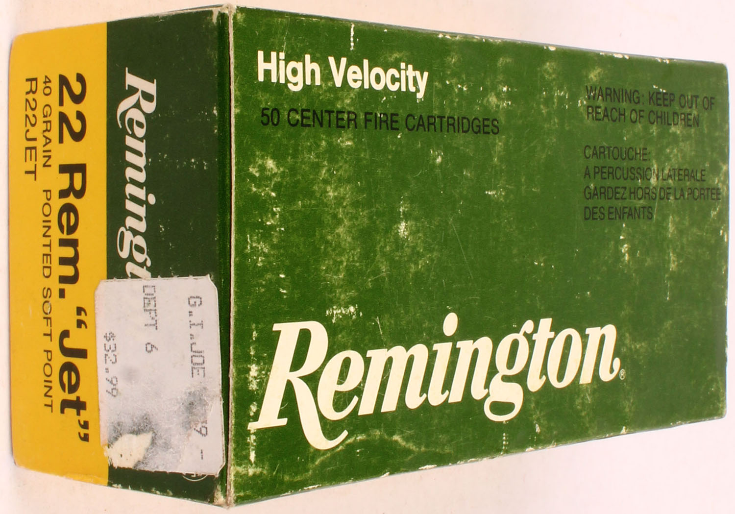 Remington, High Velocity, 22 Rem. Jet, 40 Gr. Pointed soft point, 1pc, Full, green/yellow box with white/black print, box is solid with rub marks, & sticker, ammo is Excellent. Grade: Excellent - Value: 70 to 140