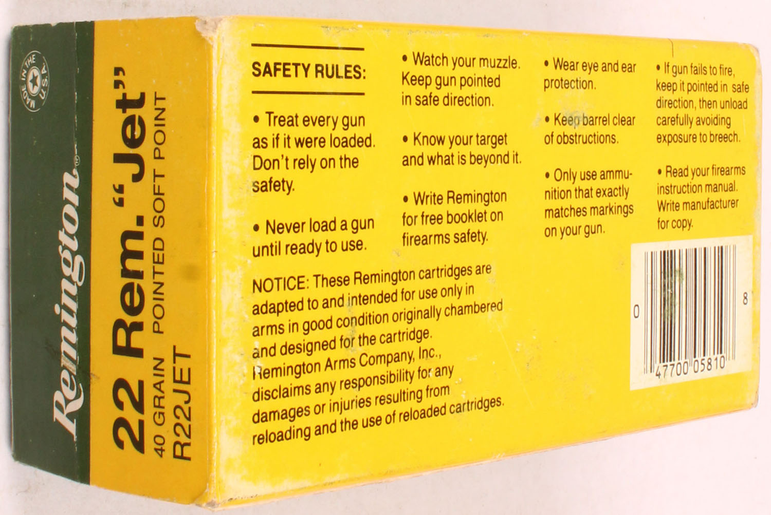 | Remington, High Velocity, 22 Rem. Jet, 40 Gr. Pointed soft point...