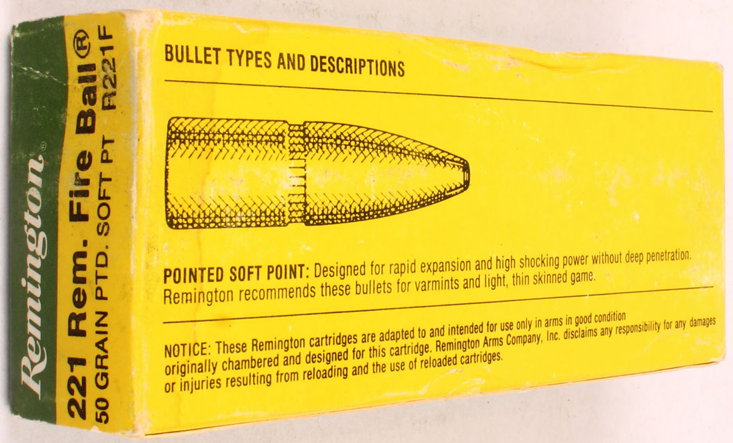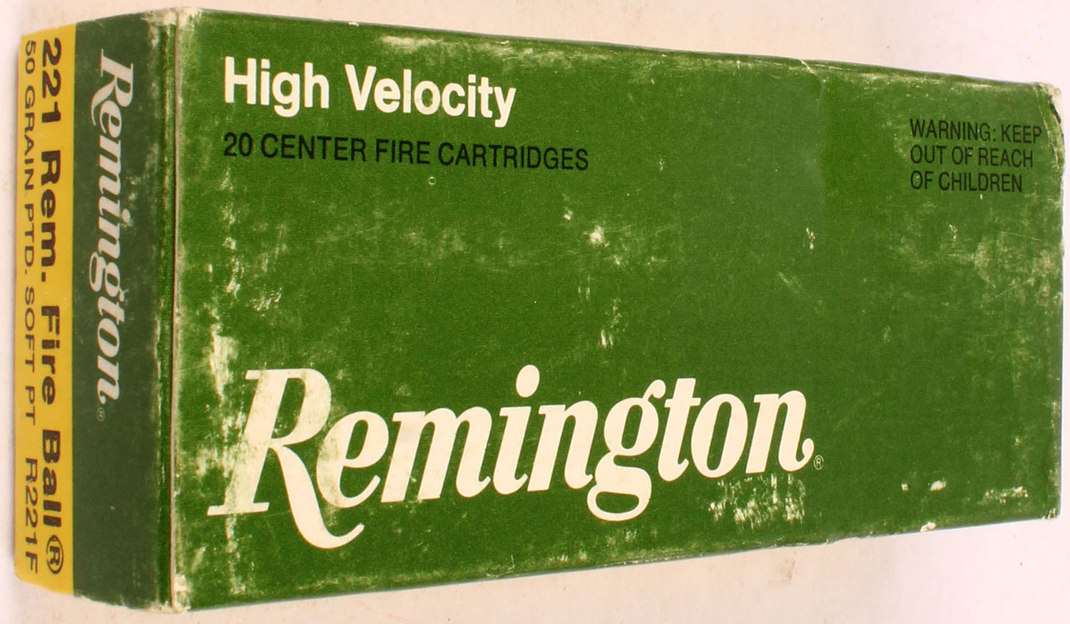 Remington, High Velocity, 221 Rem. Fire Ball, 50 Gr. Pointed soft point, 1pc, Partial 8 Rds. With 12 fired cases, green/yellow box with white/black print, box is solid with rub marks, & handling wear, ammo is Excellent. Grade: Excellent - Value: 10 to 30