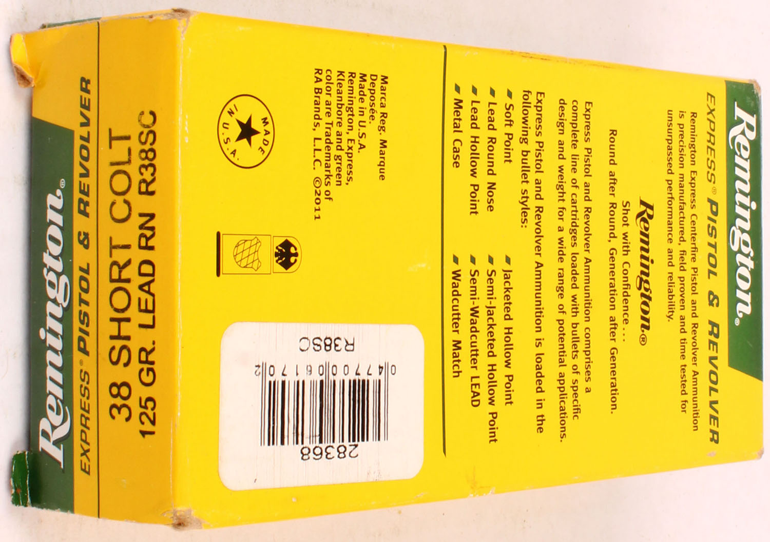 Remington, Express, .38 Short Colt, 125 Gr. Lead Rn Bullet, green/yellow box with white/black/green print, box is solid with light wear, ammo is excellent. Grade: Excellent - Value: 40 to 80