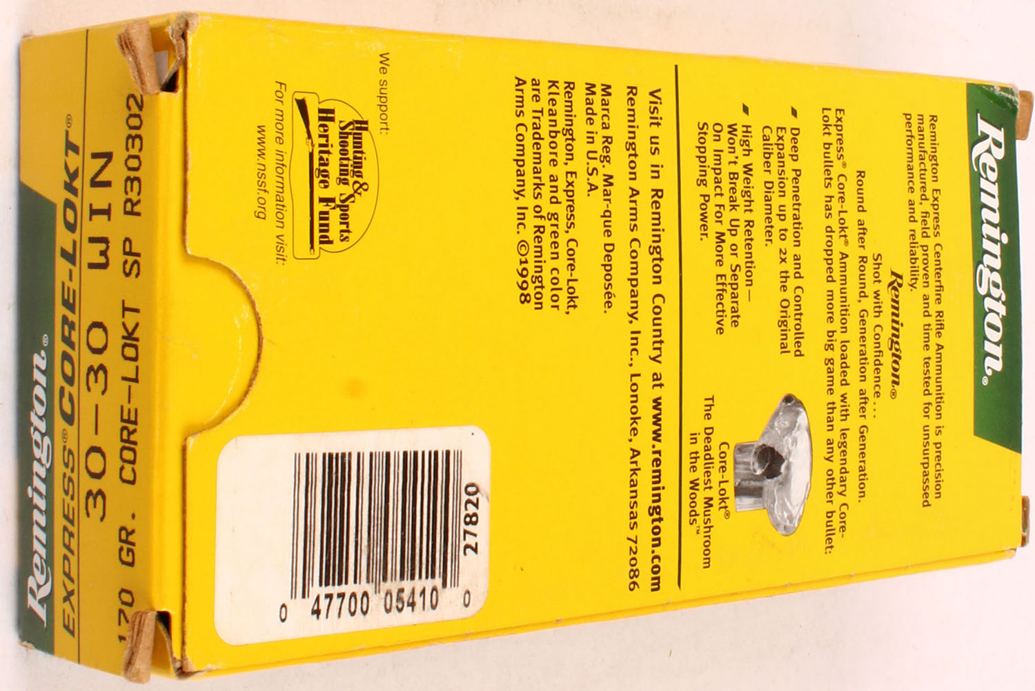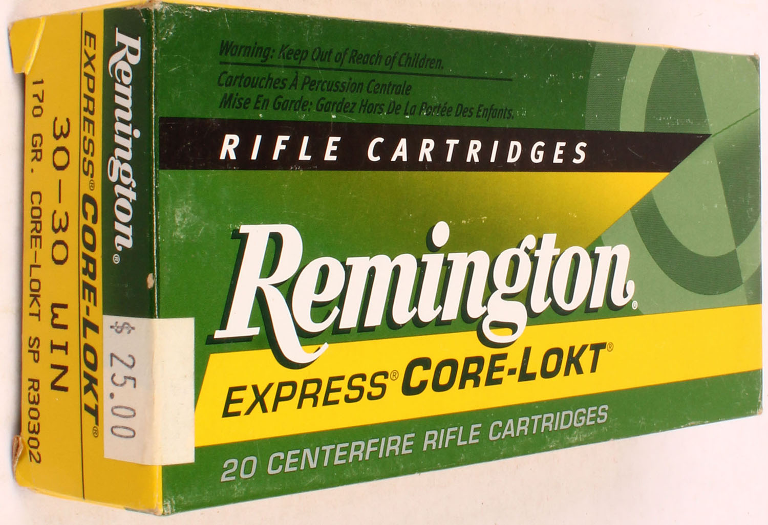 Remington, Express Core-Lokt, .30-30 Win, 170 Gr. Core-Lokt SP Bullet, green/yellow box with white/black/green print, box is solid with light wear, ammo is excellent. Grade: Excellent - Value: 30 to 60