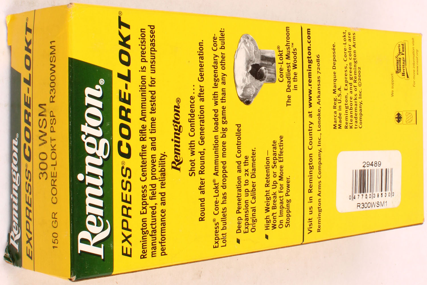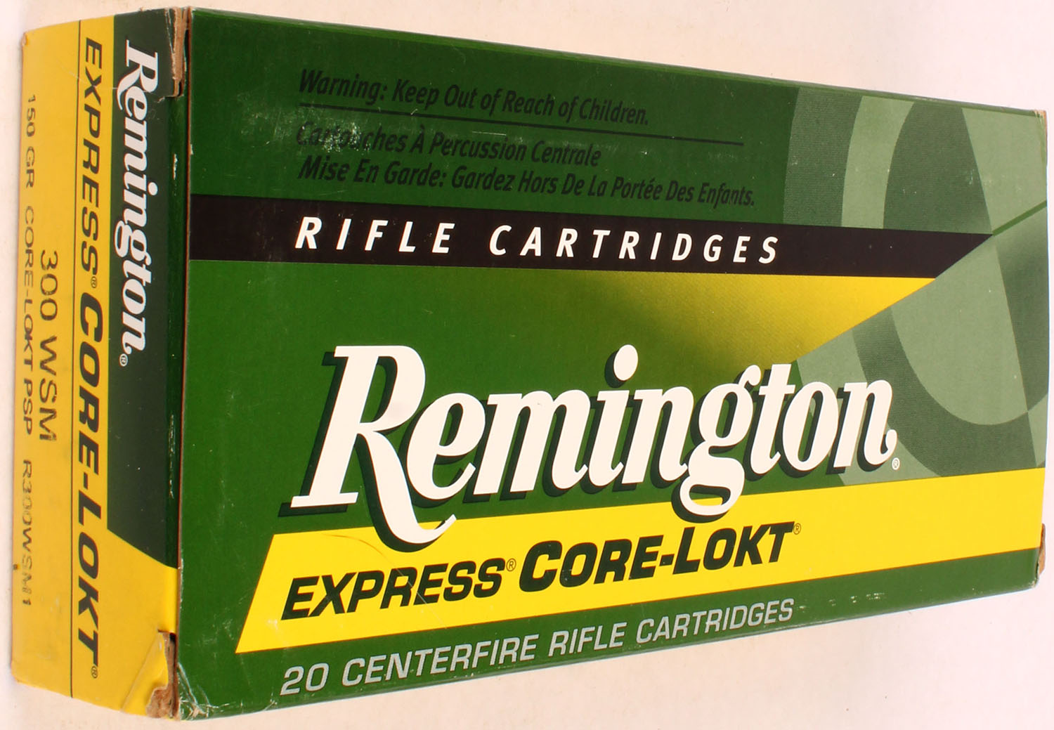 Remington, Express Core-Lokt, .300 WSM, 150 Gr. Core-Lokt PSP Bullet, green/yellow box with white/black/green print, box is solid with light wear, ammo is excellent. Grade: Excellent - Value: 30 to 60