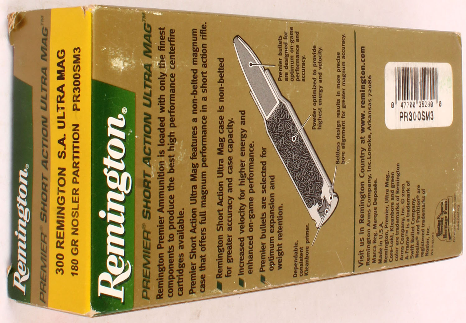 Remington, Premier, .300 Remington S.A. Ultra Mag, 180 Gr. Nosler Partition Bullet, green/yellow box with white/black/green print, box is solid with light wear, ammo is excellent. Grade: Excellent - Value: 40 to 80