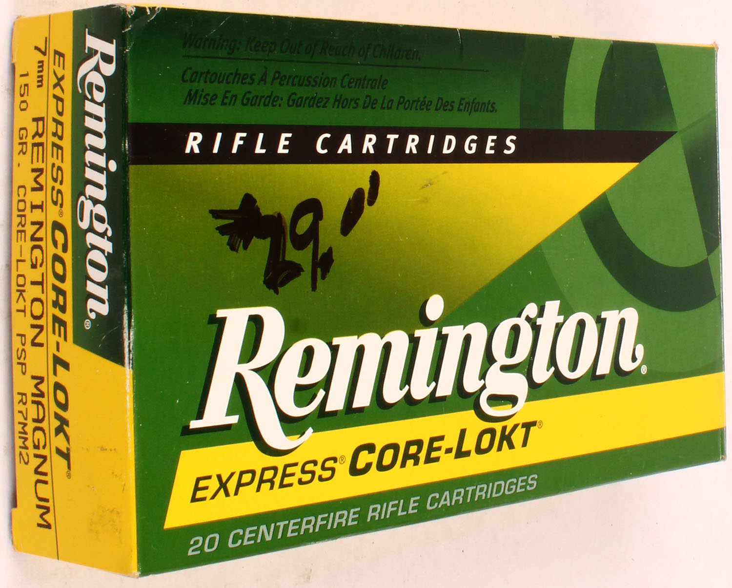 Remington, Express Core-Lokt, 7mm REM MAG, 150 Gr. Core-Lokt PSP Bullet, green/yellow box with white/black/green print, box is solid with light wear, ammo is excellent. Grade: Excellent - Value: 30 to 60