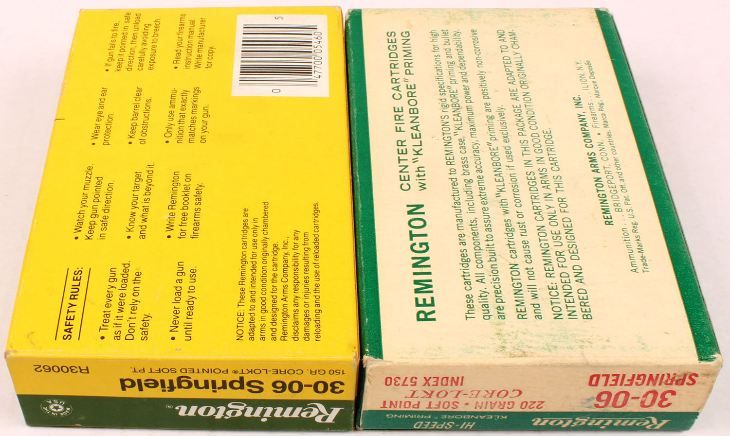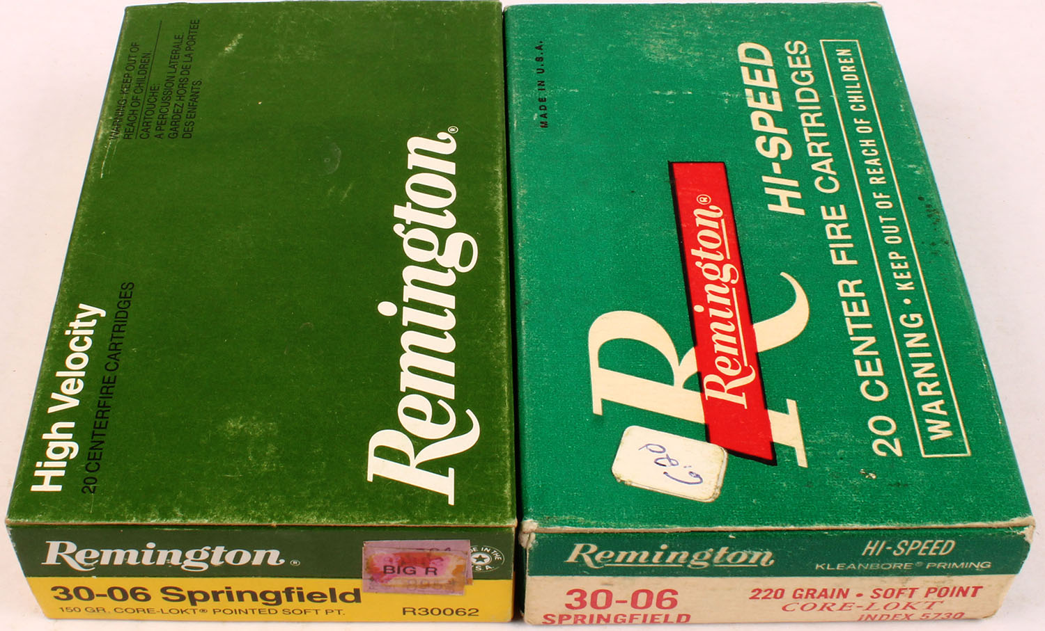 Lot of two, Remington, 30-06, one box is partial, 34 total Rds., ammo is very good to excellent. Grade: excellent - Value: 30 to 60