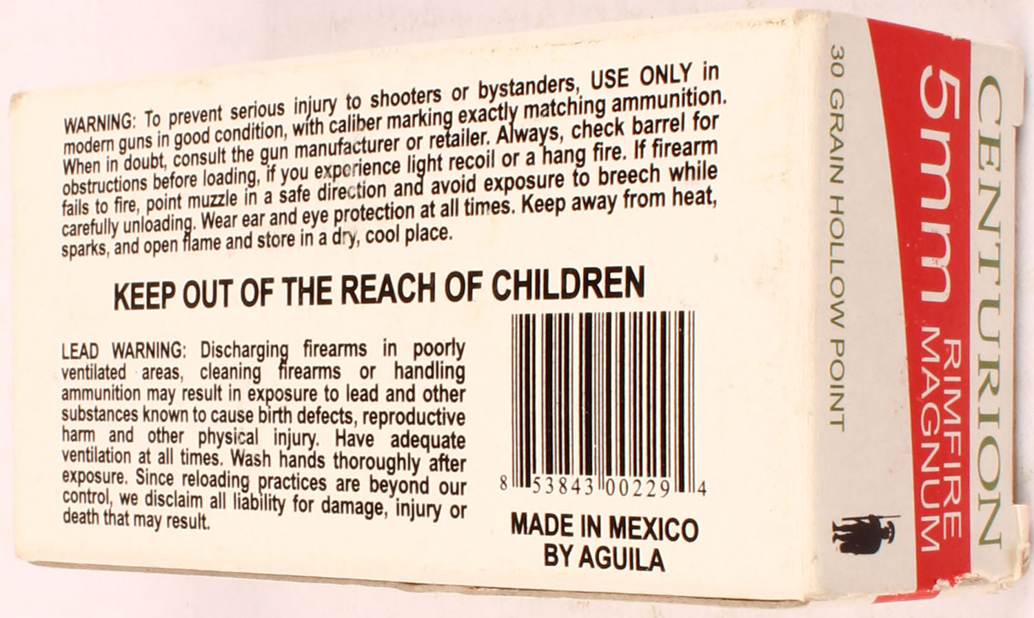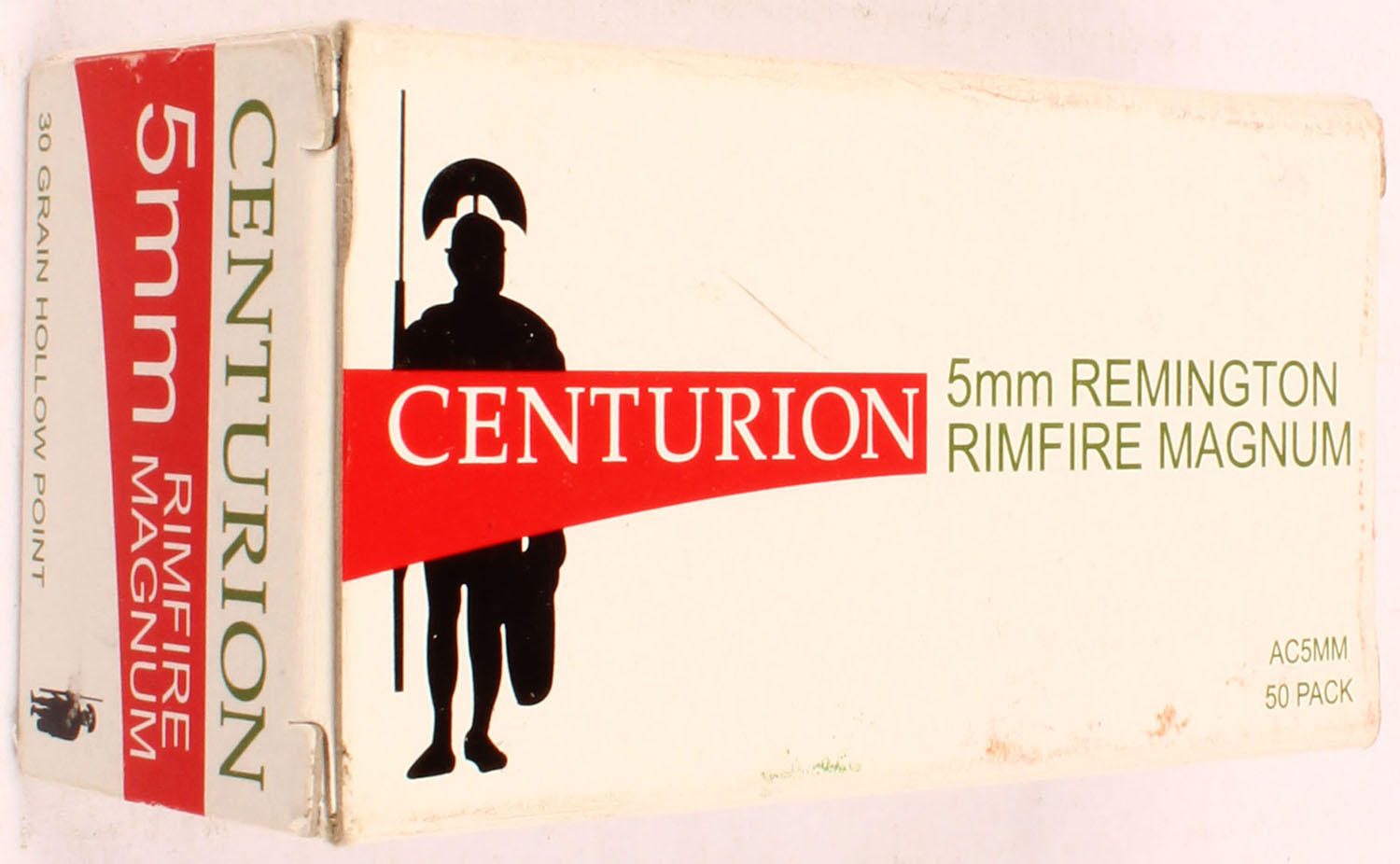 Centurion, 5mm Remington Rimfire Mag., 30 Gr. Hollow point, 1pc, Full, white box with red label & green print, box is solid with light wear, ammo is very good. Grade: Excellent - Value: 30 to 60