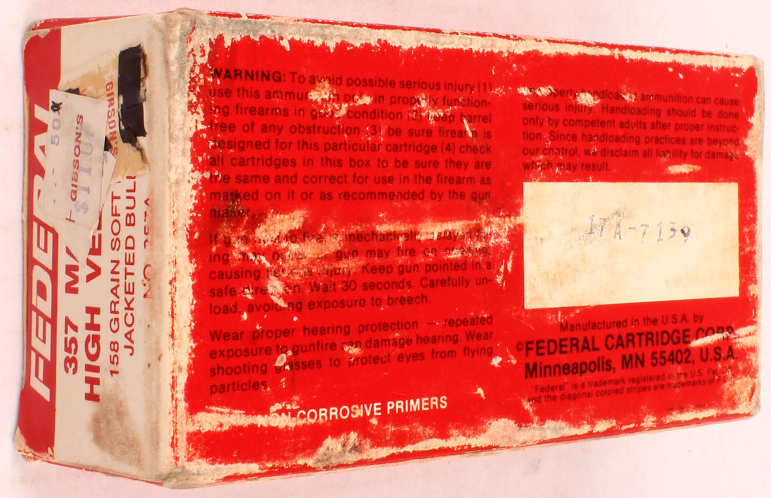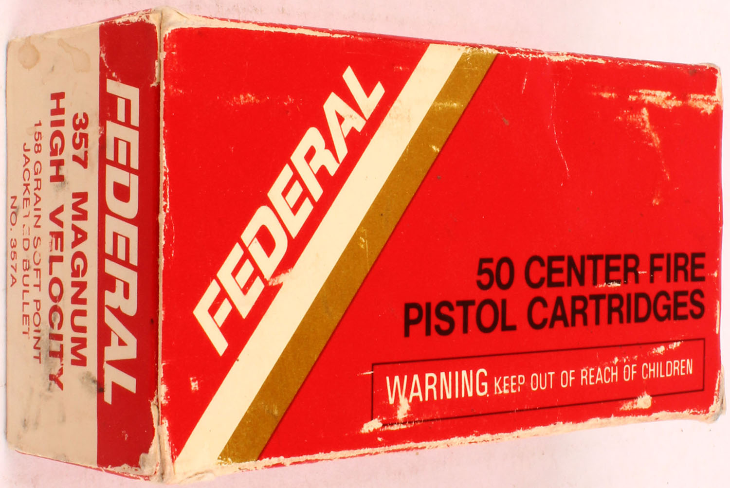 Federal, .357 Magnum High Velocity, 158 Gr. Soft Point Jacketed bullet, 1pc, Full, red box with white/gold label & white/black print, box is solid with rub marks, & handling wear, ammo is excellent. Grade: Very Good ++ - Value: 30 to 60