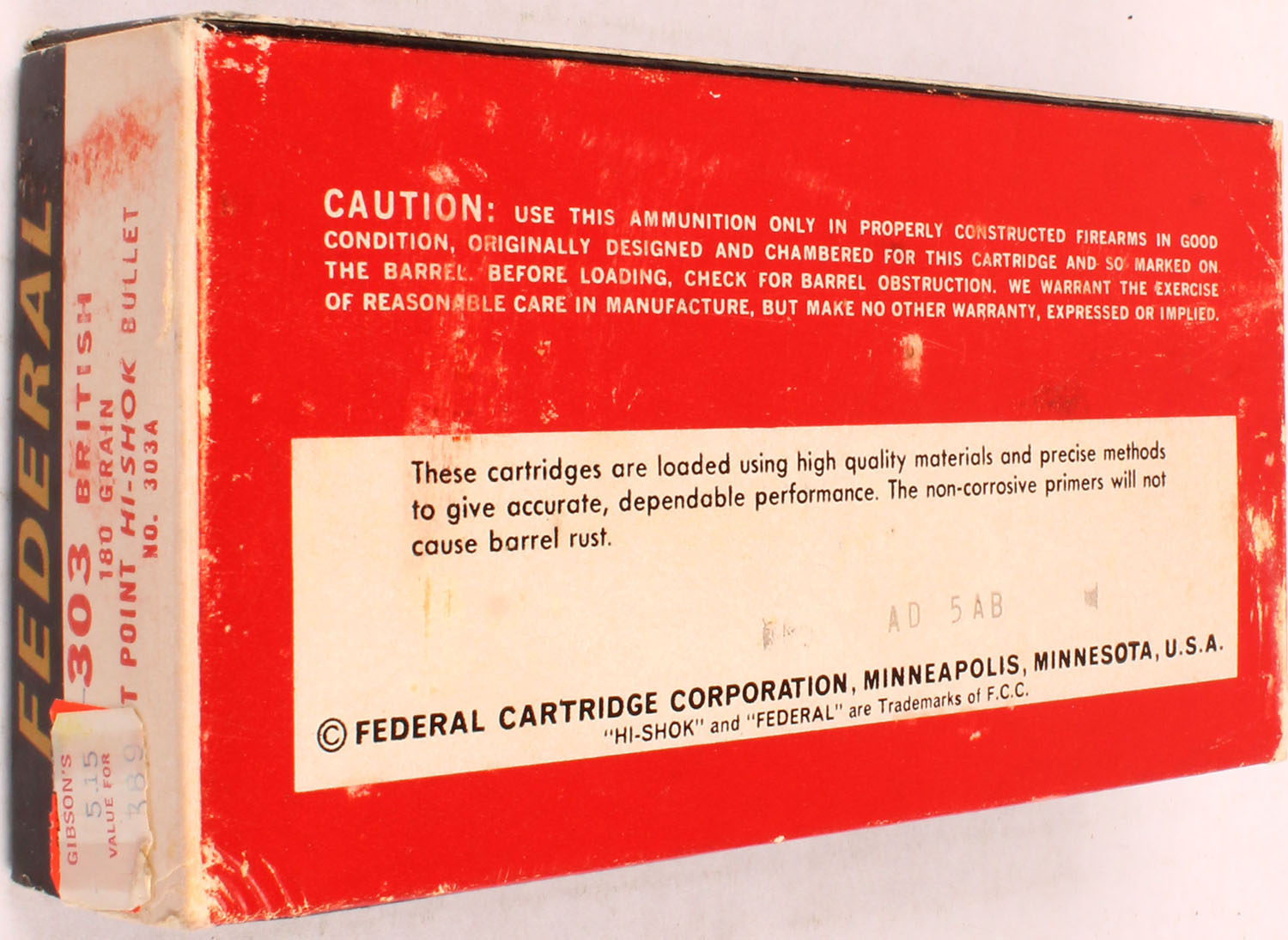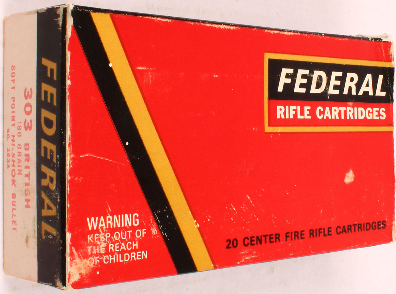 Federal, .303 British, 180 Gr. Soft Point Hi-Shok Bullet, 1pc, Full, black/red box with gold/black label with black/white print, box is solid with rub marks, ammo is Very Good. Grade: Excellent - Value: 20 to 40