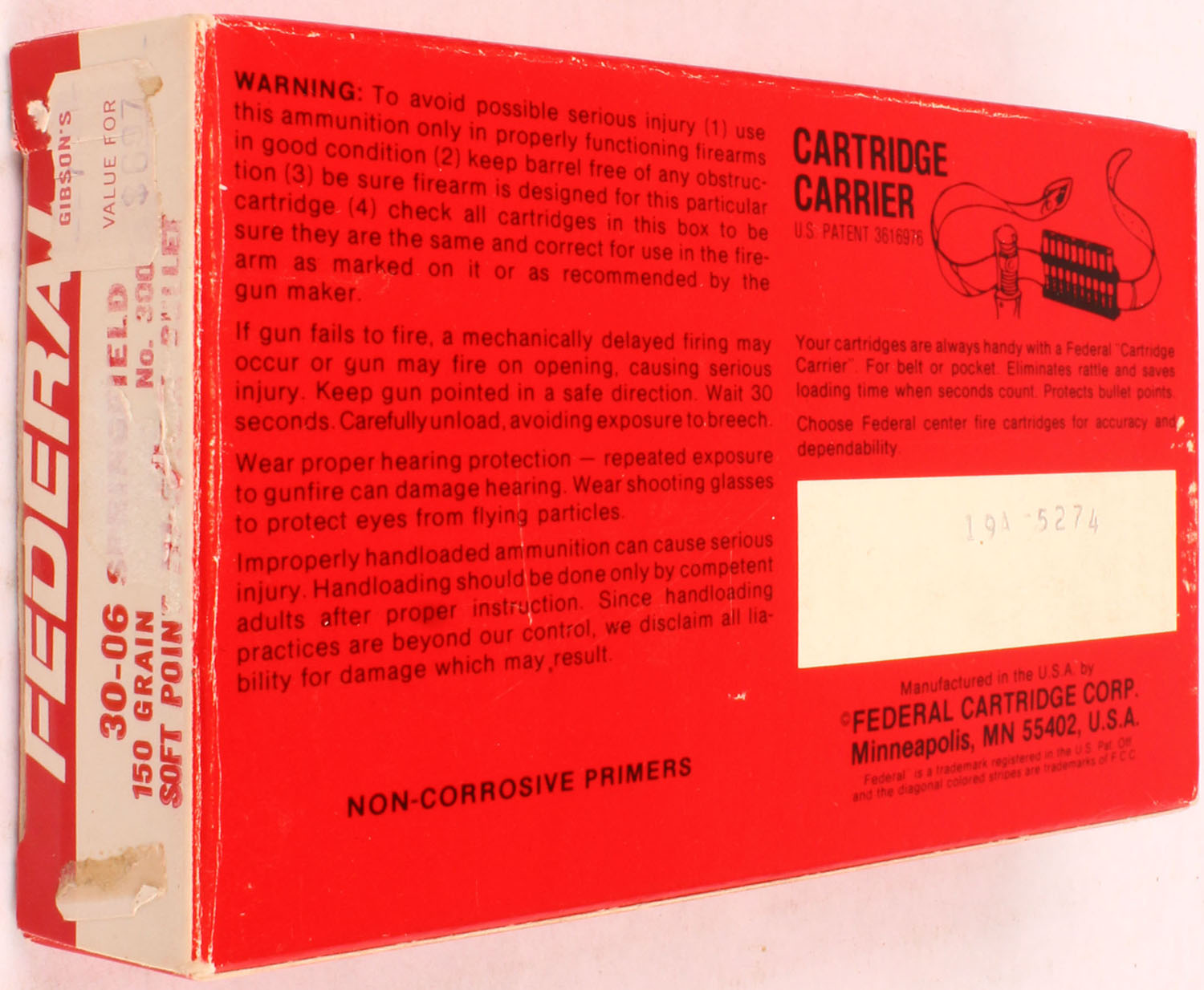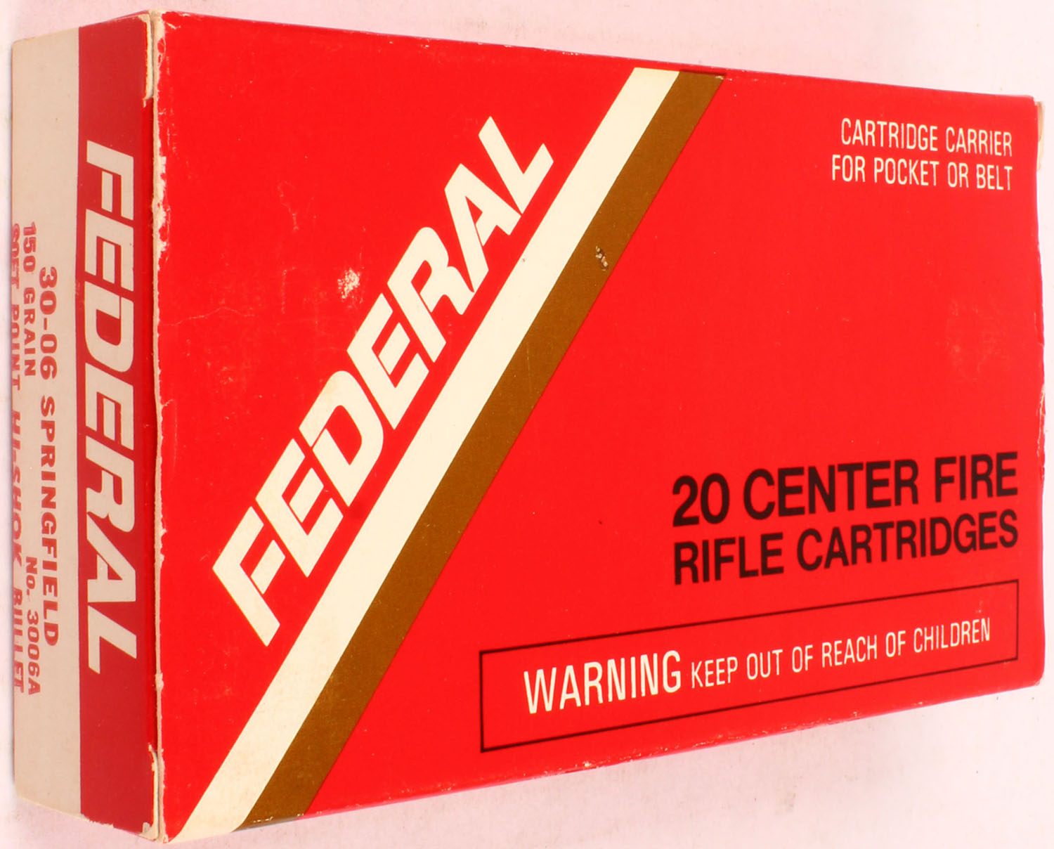 Federal, .30-06 Springfield, 150 Gr. Soft Point Hi-Shok Bullet, 1pc, Full, black/red box with gold/black label with black/white print, box is solid with rub marks, ammo is Very Good. Grade: Excellent - Value: 30 to 60
