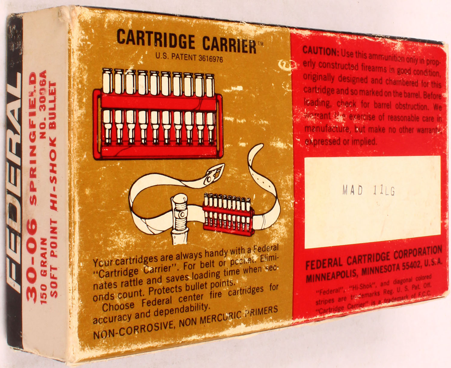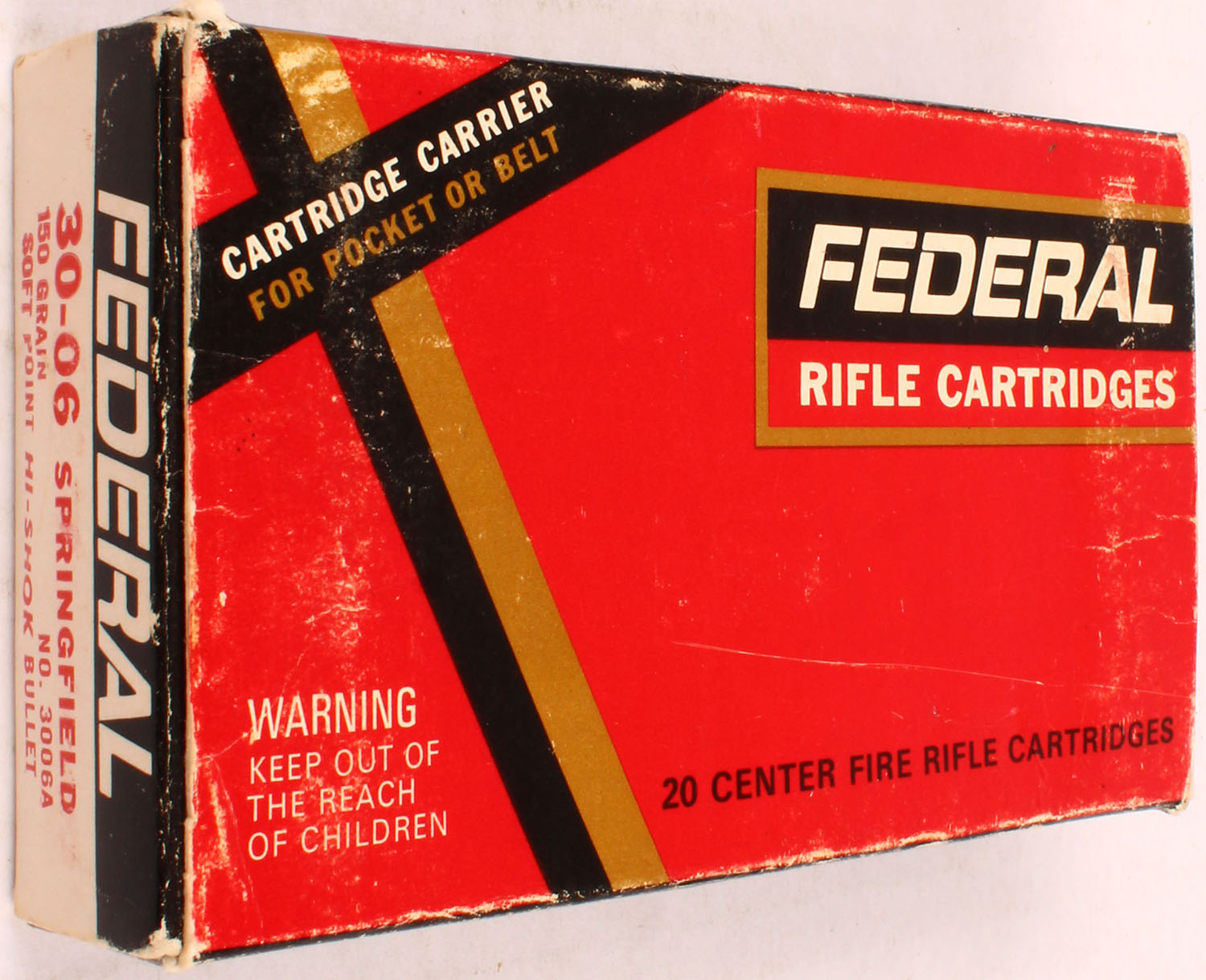 Federal, .30-06 Springfield, 150 Gr. Soft Point Hi-Shok Bullet, 1pc, Full, black/red box with gold/black label with black/white print, box is solid with rub marks, ammo is Very Good. Grade: Excellent - Value: 30 to 60