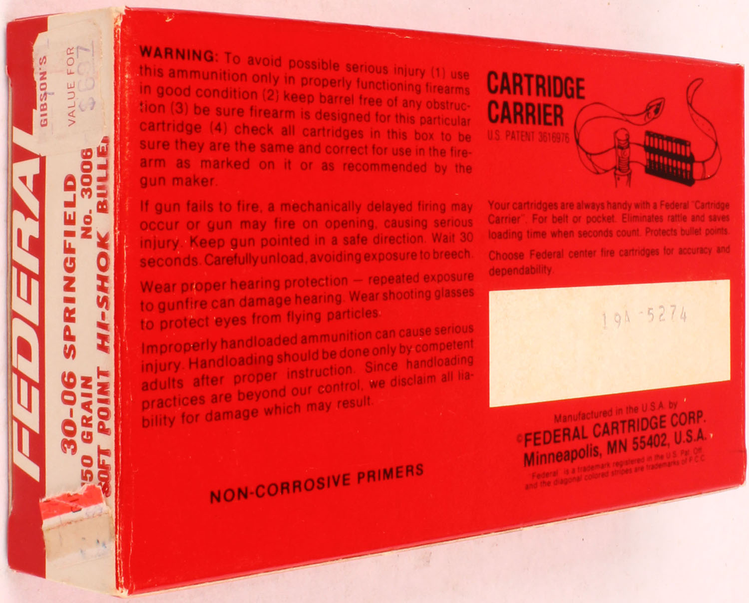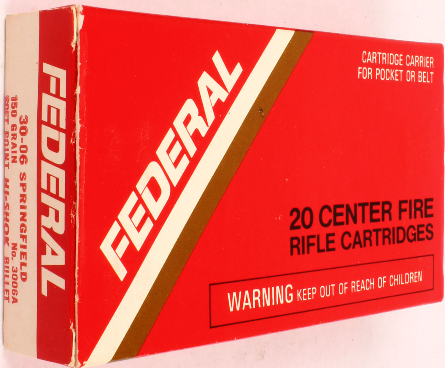 Federal, .30-06 Springfield, 150 Gr. Soft Point Hi-Shok Bullet, 1pc, Full, red box with gold/white label with black/white print, box is solid with rub marks, ammo is Very Good. Grade: Excellent - Value: 30 to 60