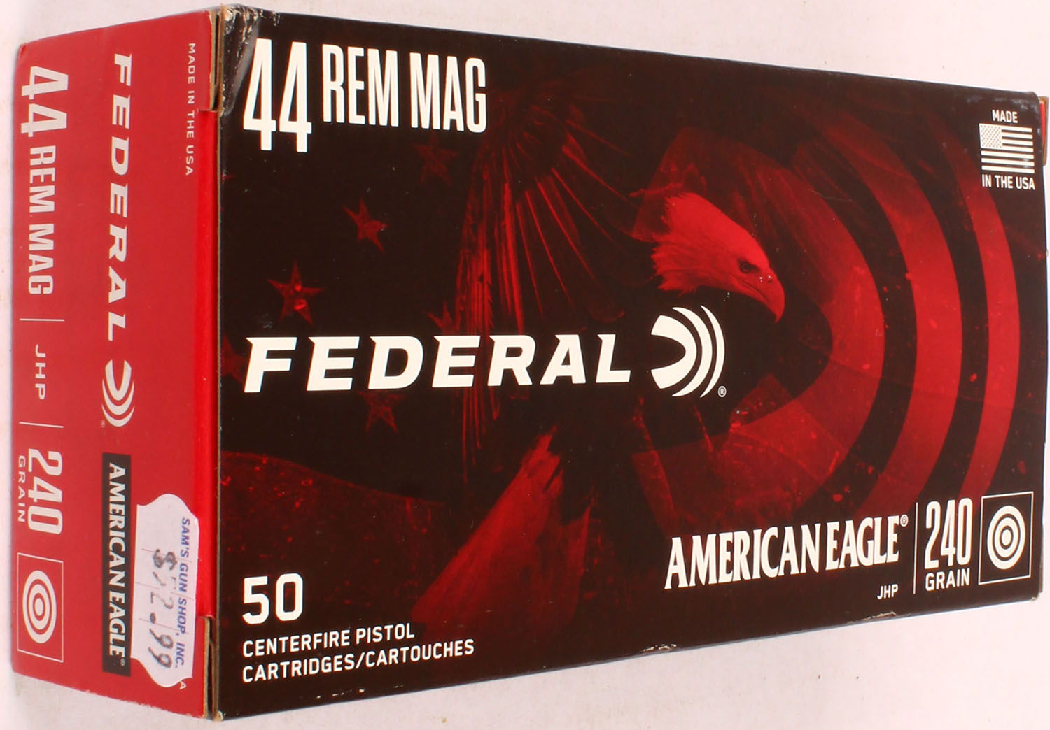 Federal, American Eagle, .44 Rem Mag., 240 Gr. JHP, 1pc, Full, red/black box with white print, box is solid with little wear, ammo is excellent. Grade: Excellent ++ - Value: 50 to 100