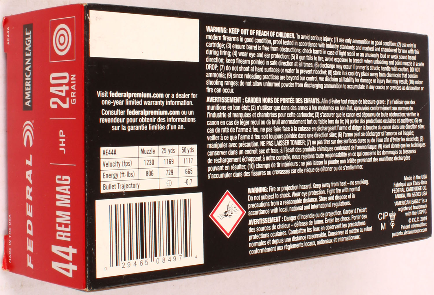 Federal, American Eagle, .44 Rem Mag., 240 Gr. JHP, 1pc, Full, red/black box with white print, box is solid with little wear, ammo is excellent. Grade: Excellent ++ - Value: 50 to 100