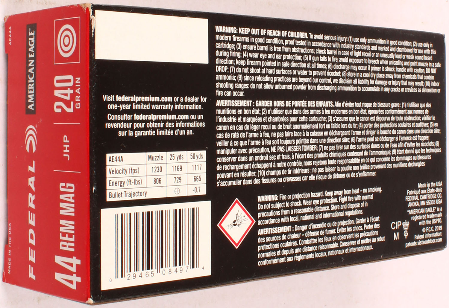 Federal, American Eagle, 44 Rem Mag JHP, 240 Grain, Full, 1pc. multi-colored box, box is solid with excellent color, Ammo is excellent. Grade: Excellent ++ - Value: 20 to 60