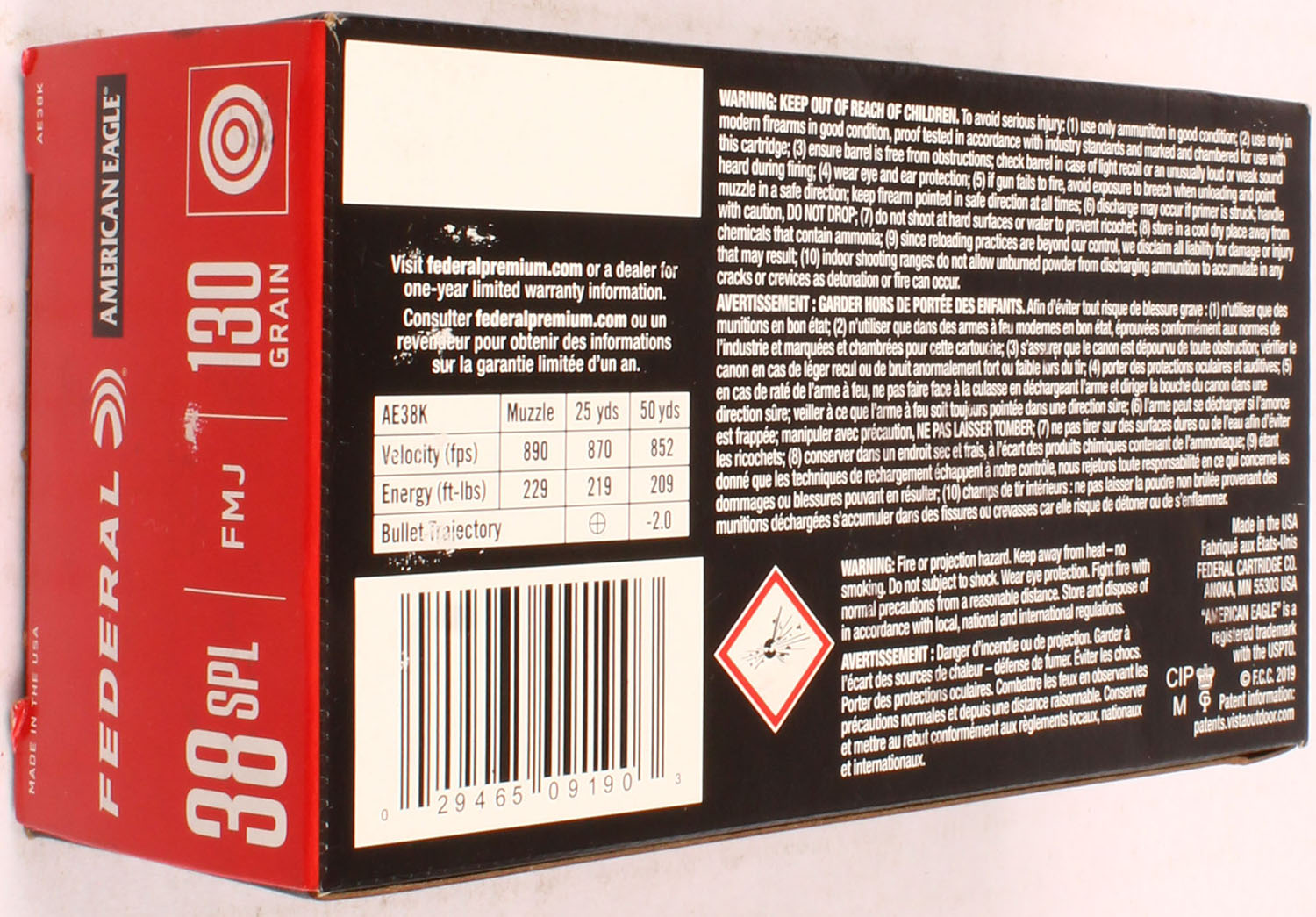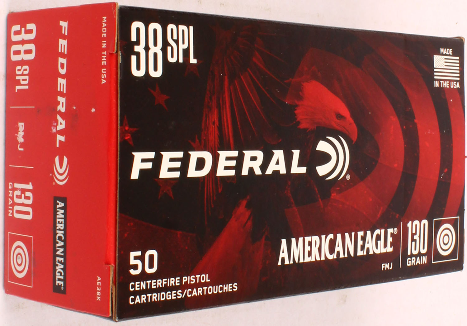 Federal, American Eagle, 38 SPL FMJ, 130 Grain, Full, 1pc. multi-colored box, box is solid with excellent color, Ammo is excellent. Grade: Excellent ++ - Value: 20 to 60