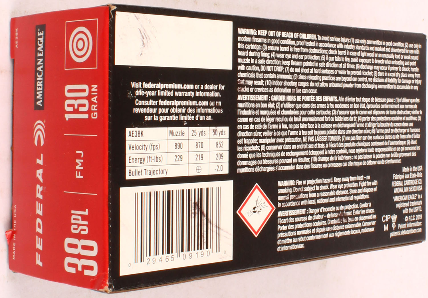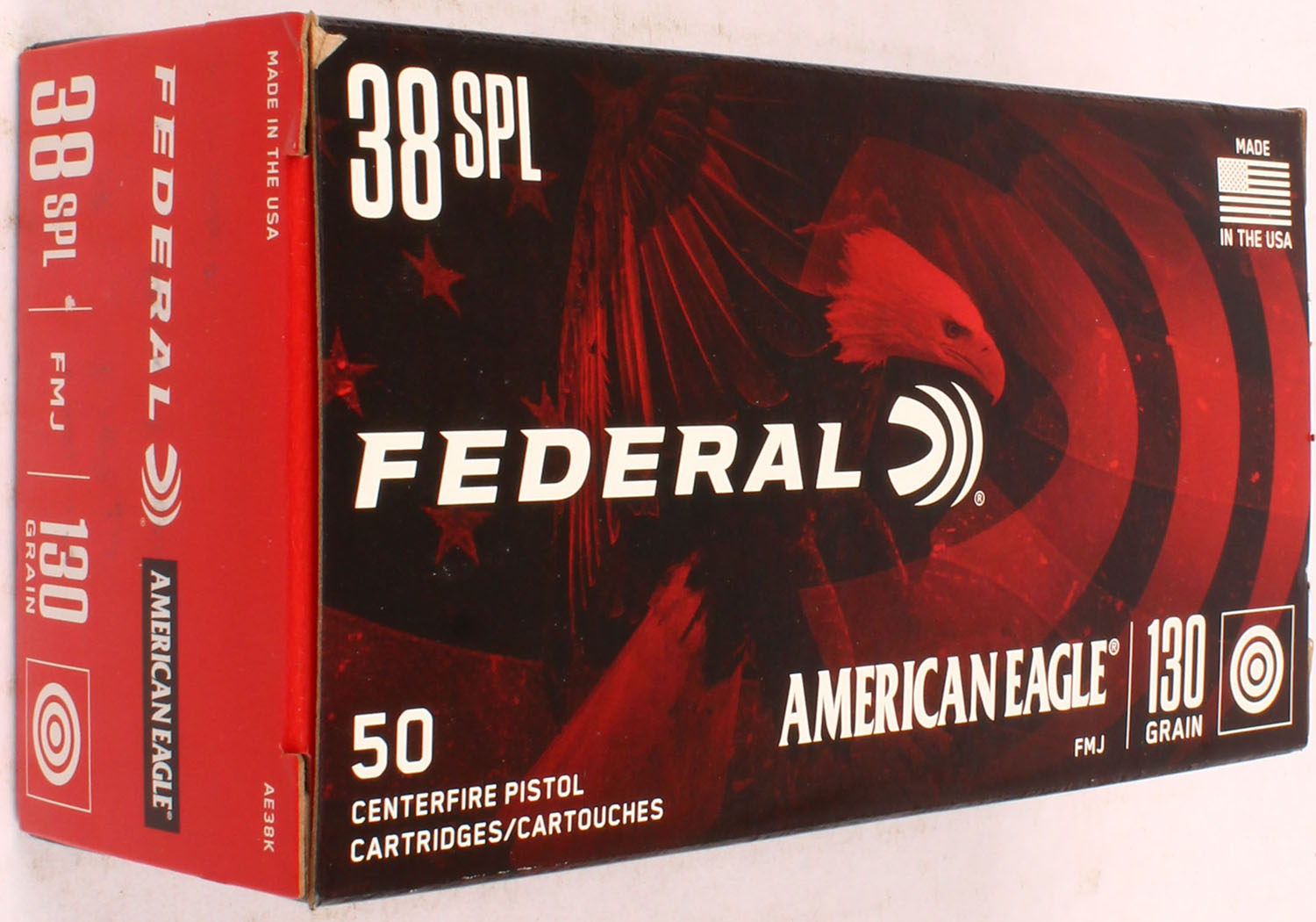 Federal, American Eagle, 38 SPL FMJ, 130 Grain, Full, 1pc. multi-colored box, box is solid with excellent color, Ammo is excellent. Grade: Excellent ++ - Value: 20 to 60