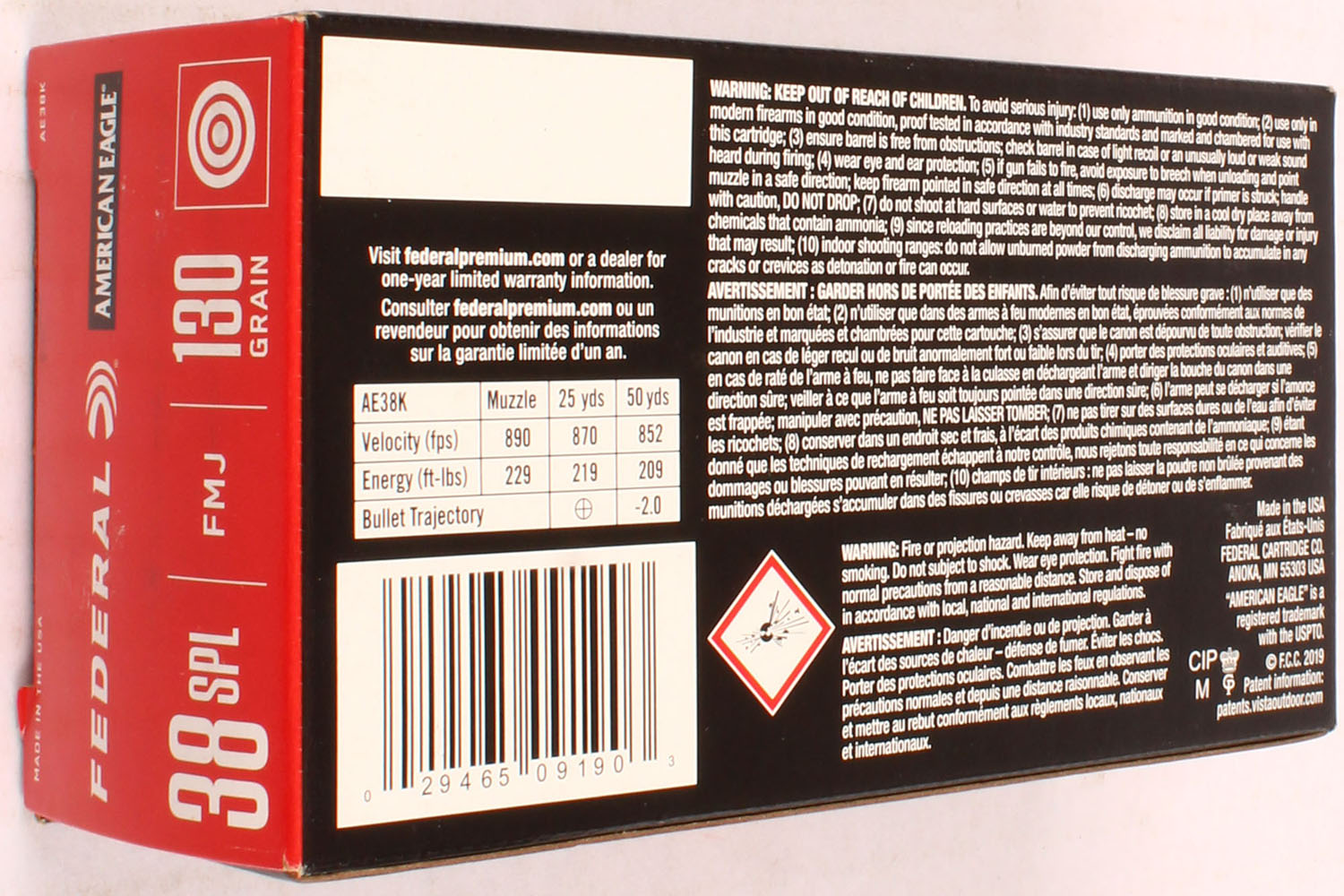 Federal, American Eagle, 38 SPL FMJ, 130 Grain, Full, 1pc. multi-colored box, box is solid with excellent color, Ammo is excellent. Grade: Excellent ++ - Value: 20 to 60