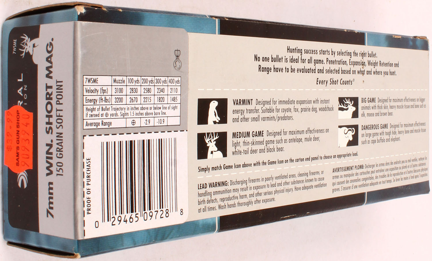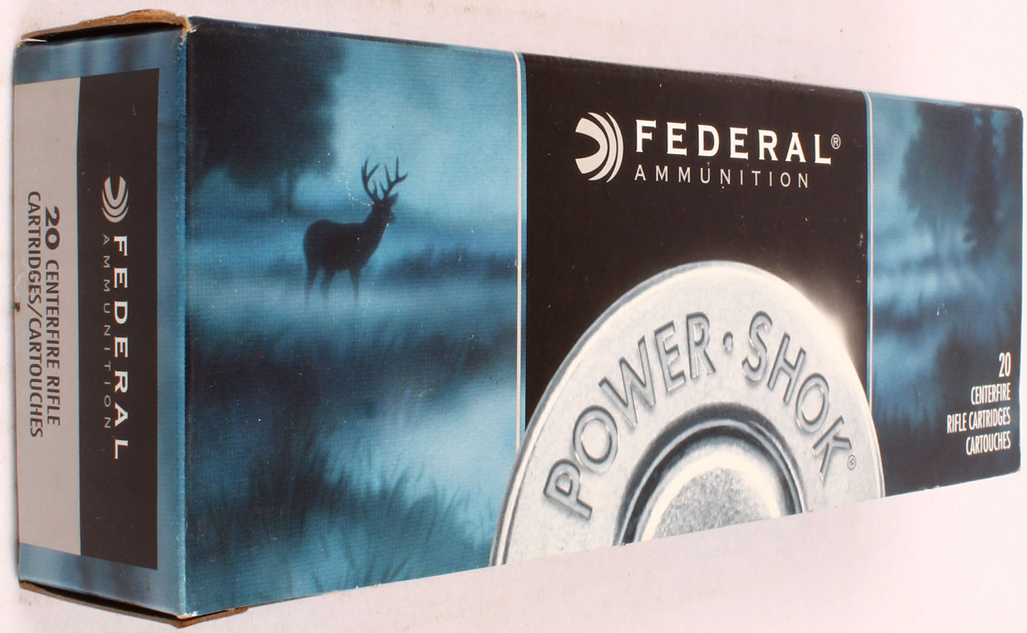 Federal, Power Shok, 7mm Win Short Mag, 150 Grain Soft Point, Full, 1pc. multi-colored box, box is solid with excellent color, Ammo is excellent. Grade: Excellent ++ - Value: 20 to 60