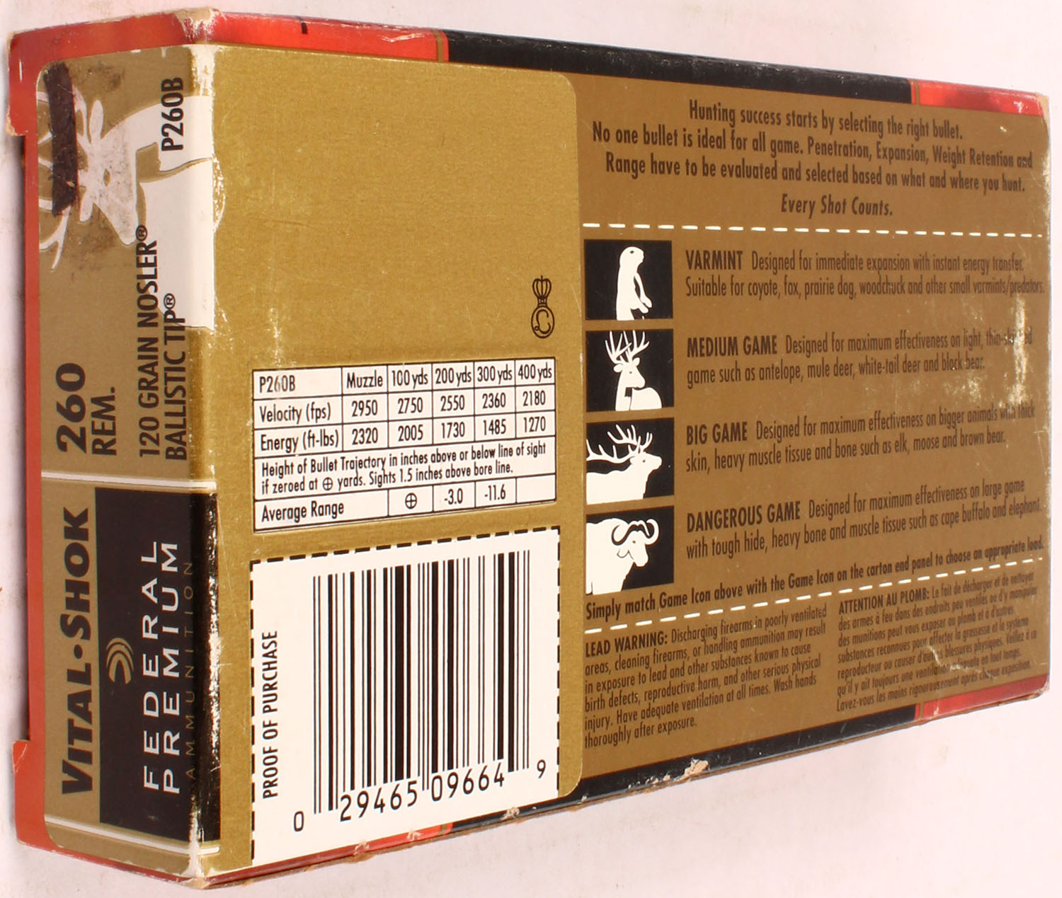 Federal Premium, Vital-Shok, 260 Rem, 120 Grain Nosler Ballistic Tip, Full, 1pc. multi-colored box, box is solid with excellent color, Ammo is excellent. Grade: Excellent + - Value: 20 to 60