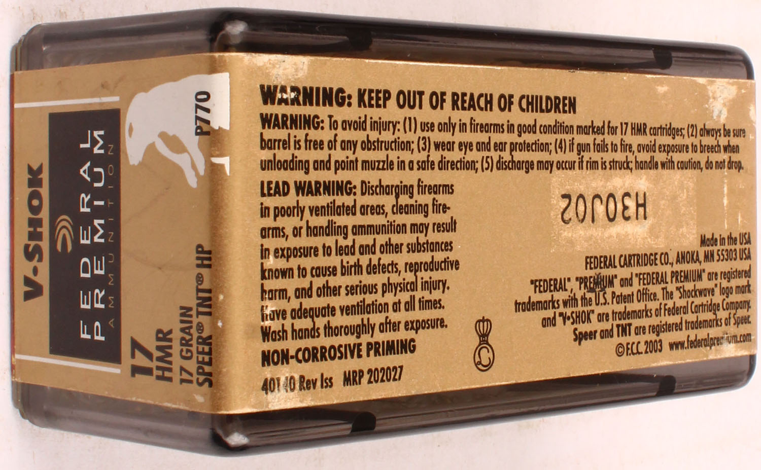 | Federal Premium, V-Shok, 17 HMR, 17 Grain Speer TNT HP, FULL & ...