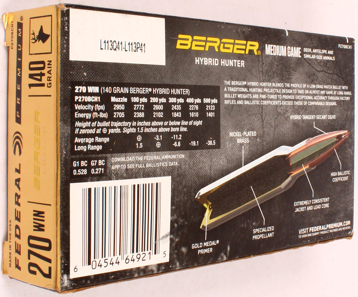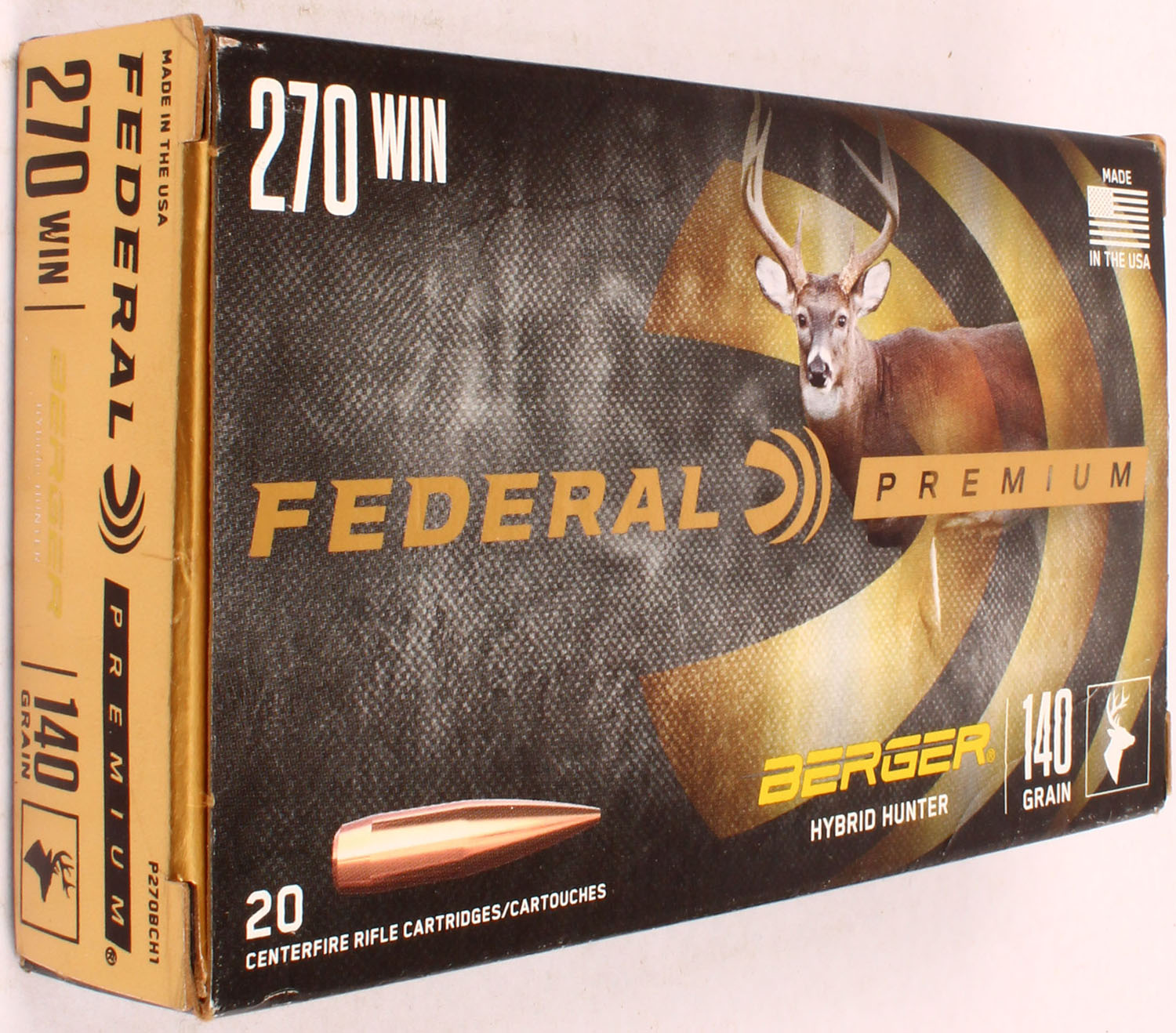 Federal Premium, 270 Win, 140 Grain Berger Hybrid Hunter, Full, 1pc. multi-colored box, box is solid with excellent color, Ammo is excellent. Grade: Excellent ++ - Value: 20 to 60