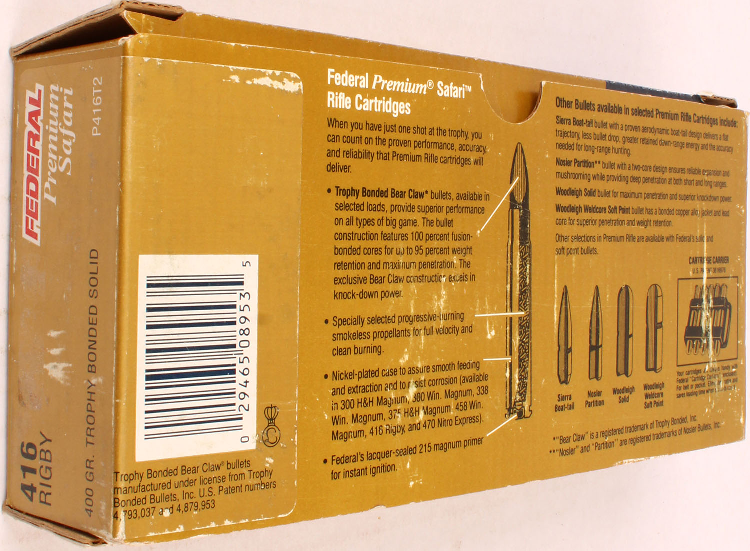 Federal Premium Safari, 416 Rigby, 400 Grain Trophy Bonded Solid, Full, 1pc. multi-colored box, box is solid with excellent color, Ammo is excellent. Grade: Excellent - Value: 20 to 80