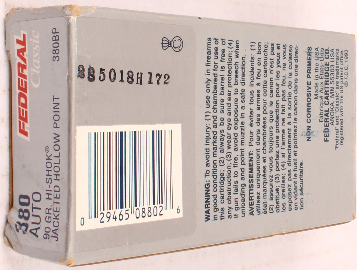 Federal Classic, 380 Auto, 90 Grain Hi-Shok JHP, Full, 1pc. multi-colored box, box is solid with excellent color, Ammo is excellent. Grade: Excellent - Value: 20 to 60