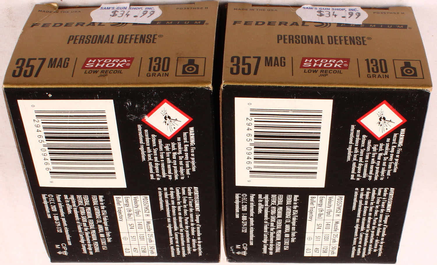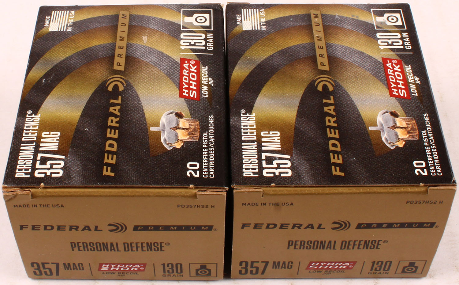 Lot of 2 Federal Premium, Personal Defense, 357 Mag, 130 Grain Hydra-Shok Low Recoil JHP, Full, 1pc. multi-colored box, box is solid with excellent color, Ammo is excellent. Grade: Excellent ++ - Value: 20 to 60