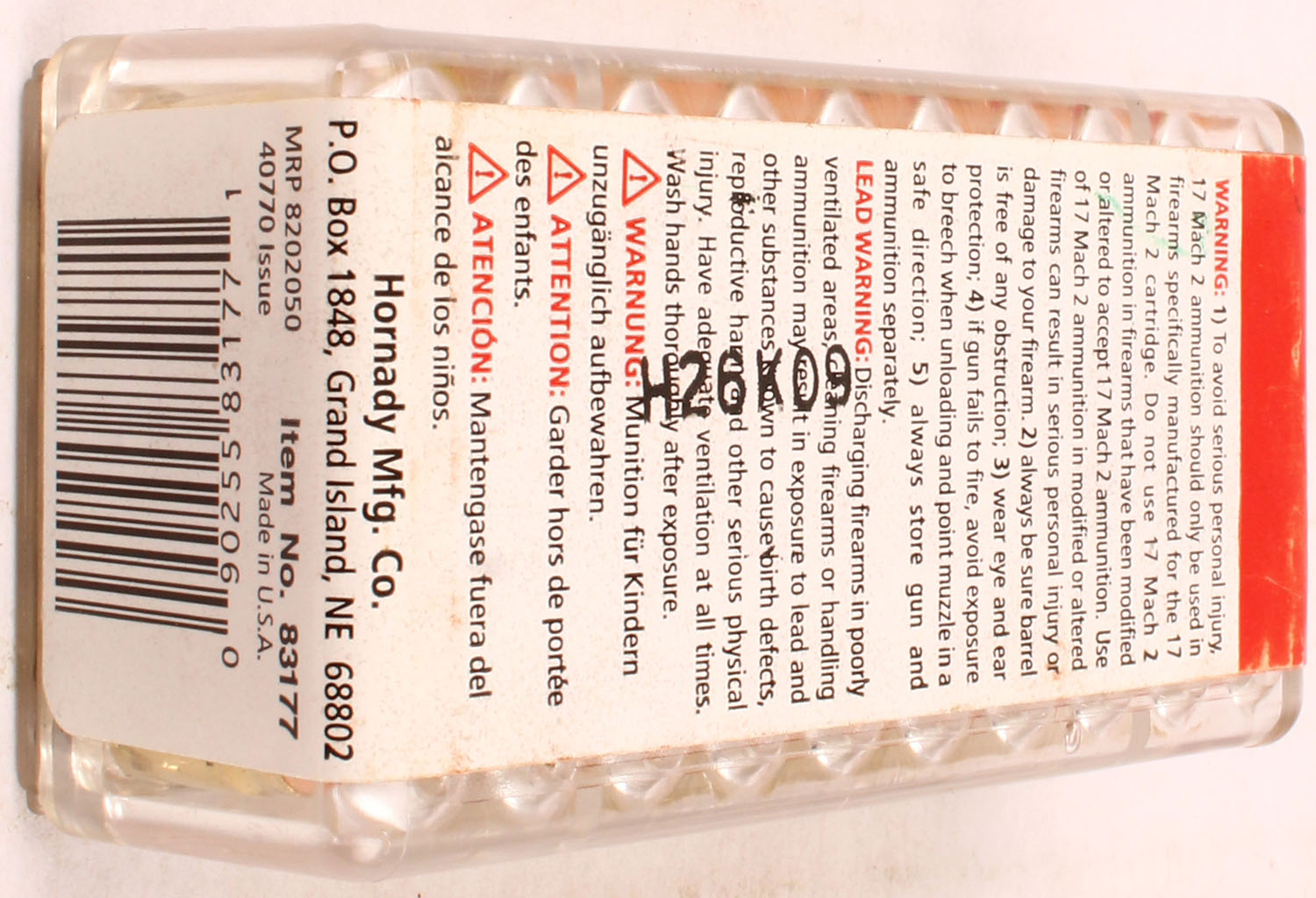 Hornady, 17 Mach 2 with over stamp stating ''First Production Run'', 17 Grain V-Max, FULL & SEALED, 1pc. multi-colored box, box is solid with excellent color, Ammo is excellent. Grade: Excellent ++ - Value: 10 to 60
