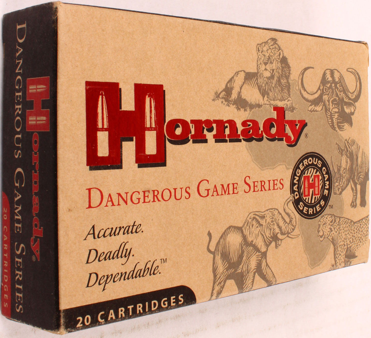 Hornady, Dangerous Game Series, 375 H&H, 270 Grain SP-RP, Full, 1pc. multi-colored box, box is solid with excellent color, Ammo is excellent. Grade: Excellent ++ - Value: 20 to 60