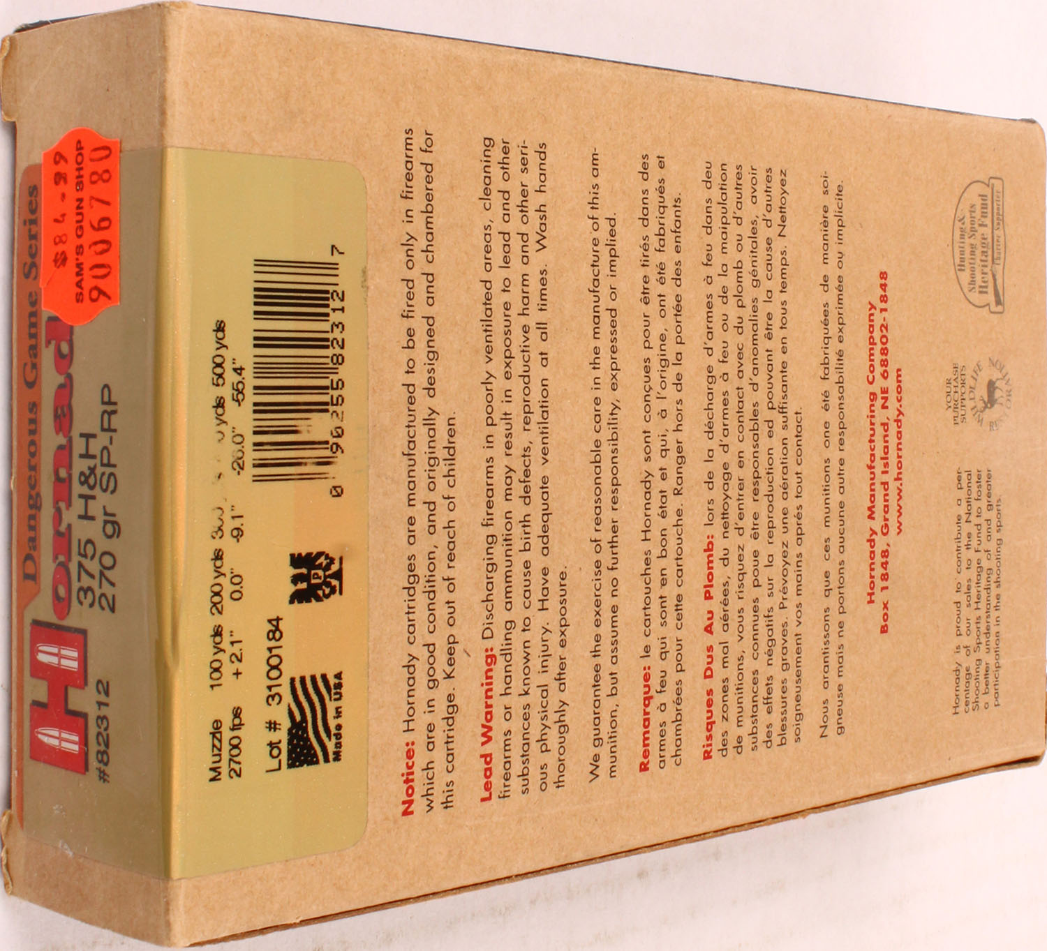 Hornady, Dangerous Game Series, 375 H&H, 270 Grain SP-RP, Full, 1pc. multi-colored box, box is solid with excellent color, Ammo is excellent. Grade: Excellent ++ - Value: 20 to 60