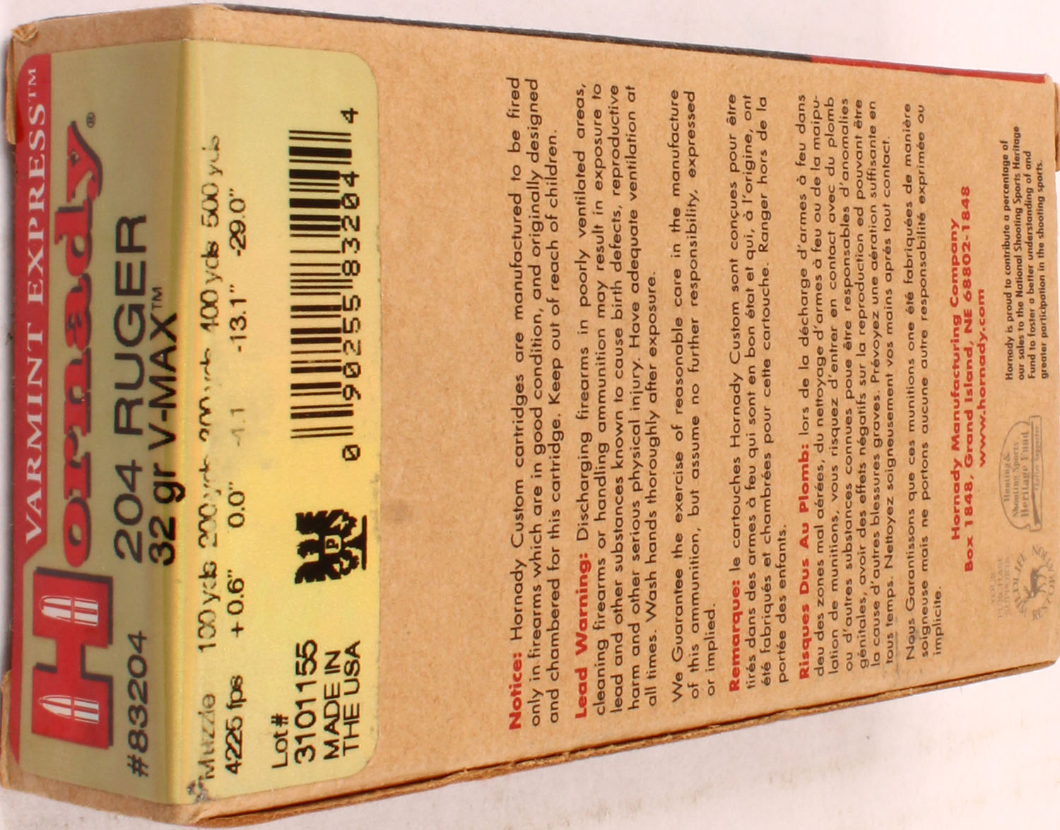 Hornady, Custom, 204 Ruger, 32 Grain V-Max, Full, 1pc. multi-colored box, box is solid with excellent color, Ammo is excellent. Grade: Excellent ++ - Value: 20 to 60