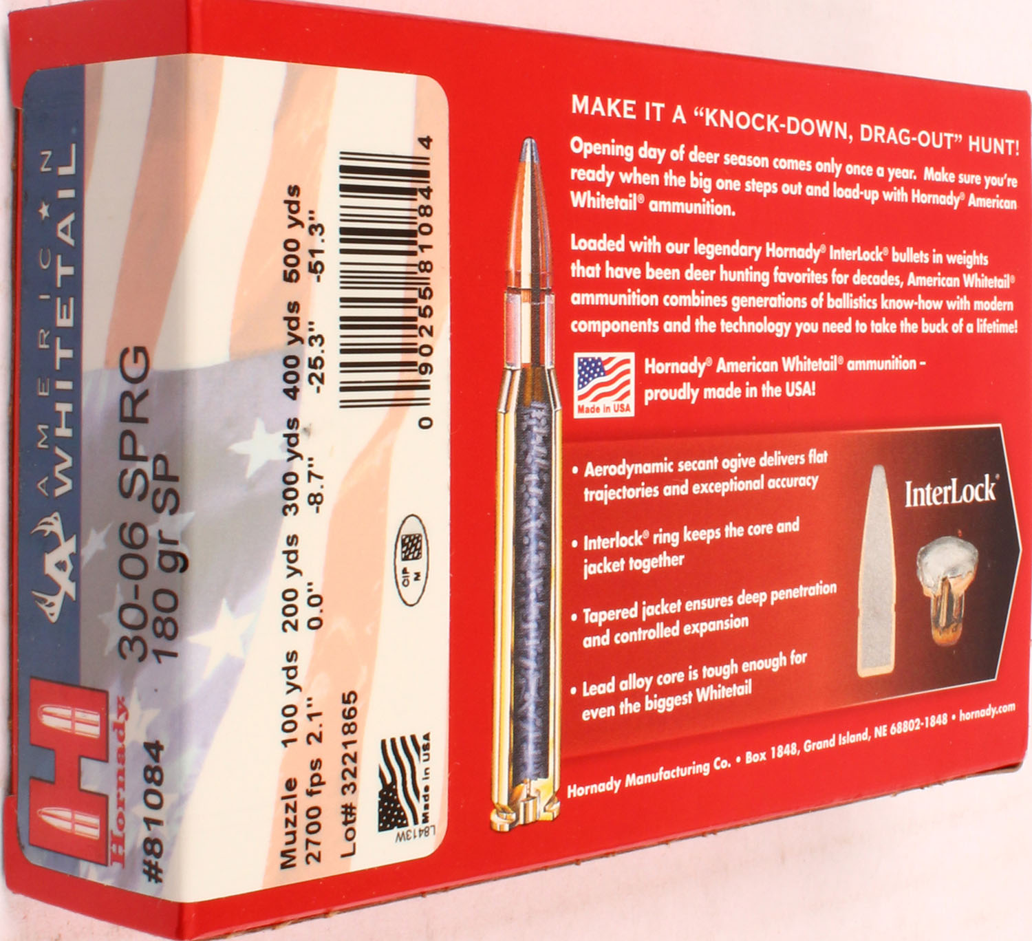 Hornady, American Whitetail, 30-06 SPRG, 180 Grain SP, Full, 1pc. multi-colored box, box is solid with excellent color, Ammo is excellent. Grade: Excellent ++ - Value: 20 to 60