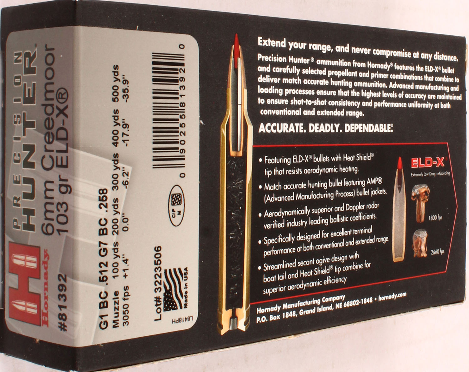 Hornady, Precision Hunter, 6mm Creedmoor, 103 Grain ELD-X, Full, 1pc. multi-colored box, box is solid with excellent color, Ammo is excellent. Grade: Excellent ++ - Value: 20 to 60