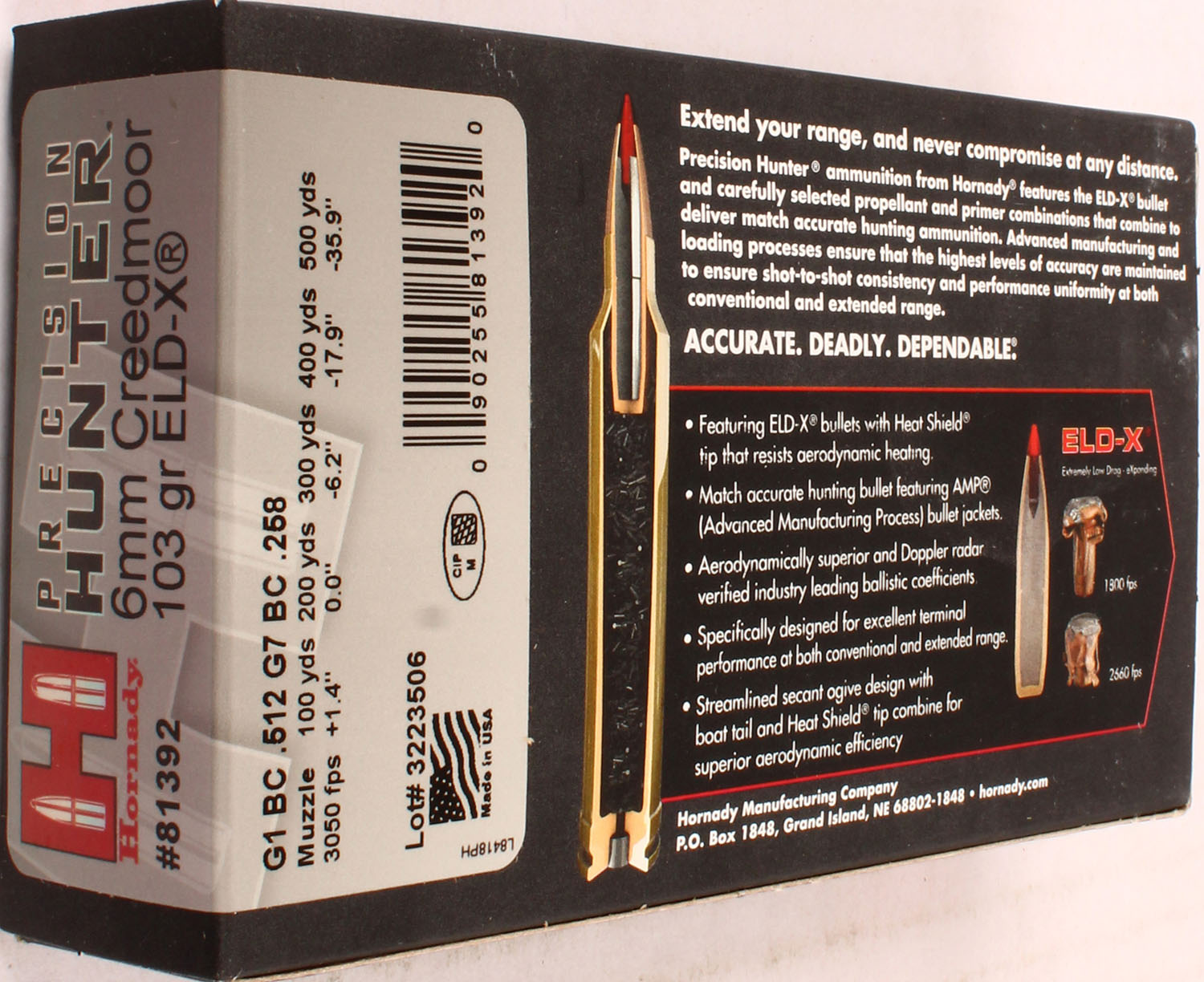 Hornady, Precision Hunter, 6mm Creedmoor, 103 Grain ELD-X, Full, 1pc. multi-colored box, box is solid with excellent color, Ammo is excellent. Grade: Excellent ++ - Value: 20 to 60