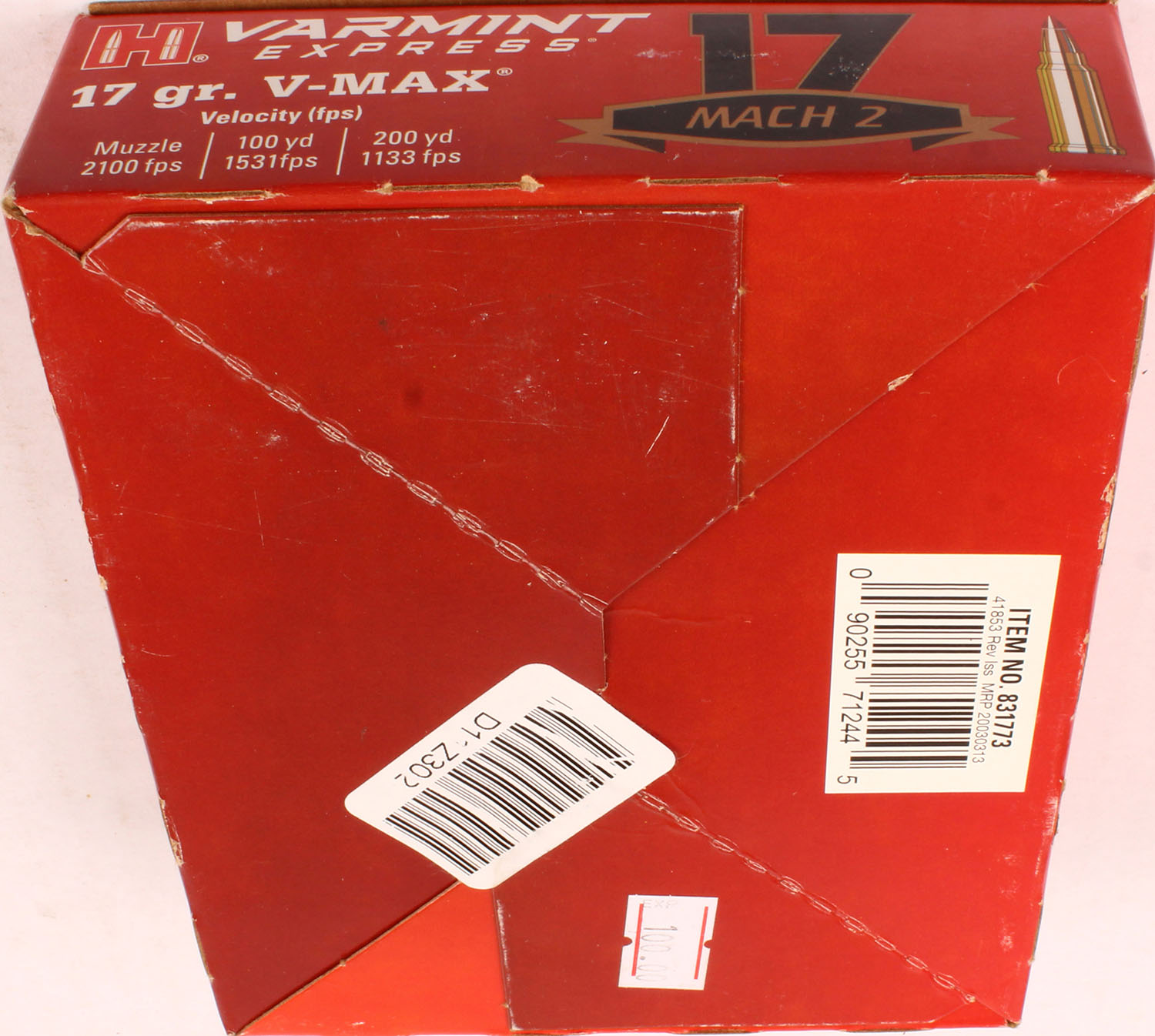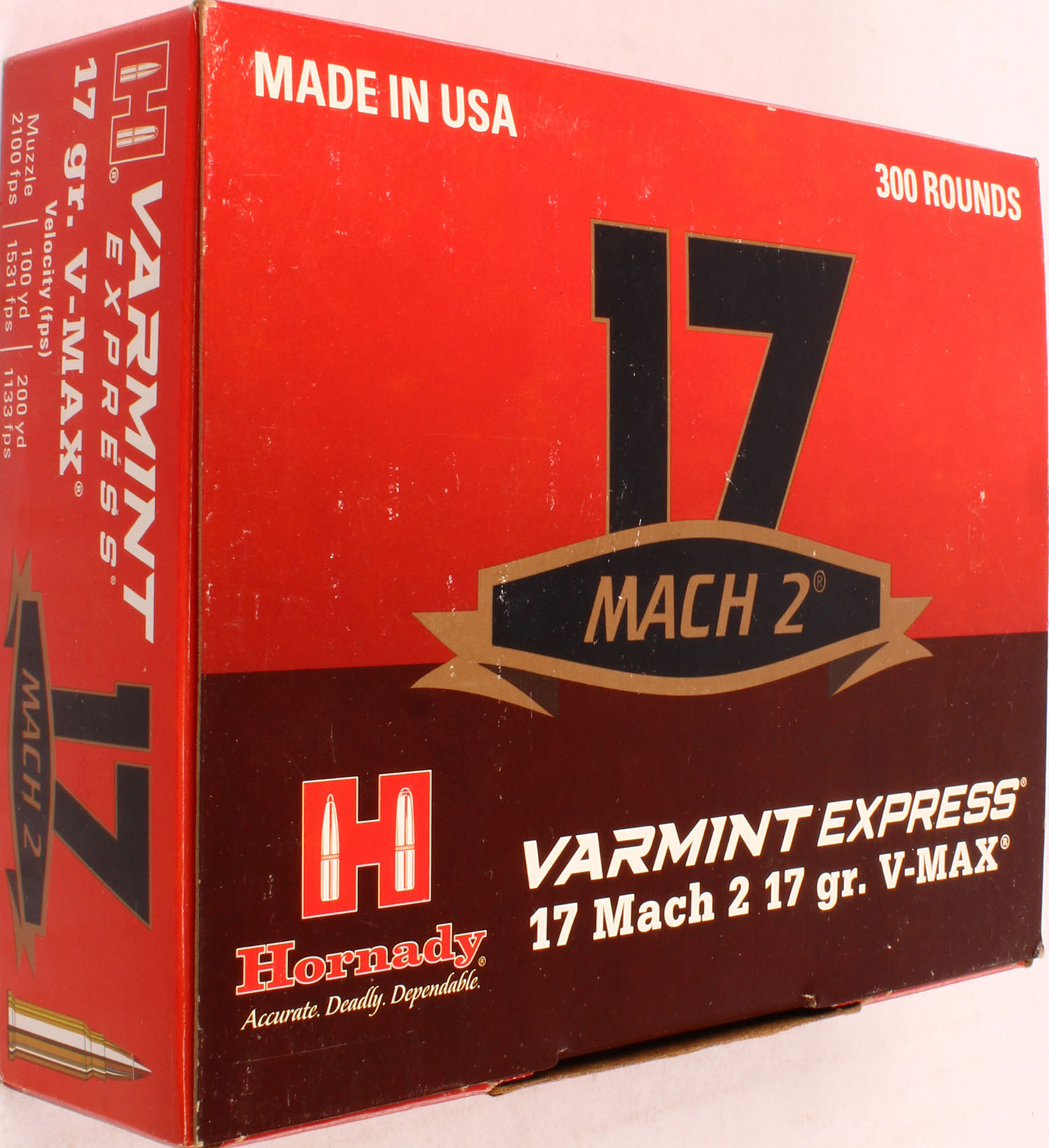 Hornady, Varmint Express, 17 Mach 2, 17 Grain V-Max, 300 Rds., Full, 1pc. multi-colored box, box is solid with excellent color, Ammo is mint. New. Grade: Excellent ++ - Value: 50 to 180