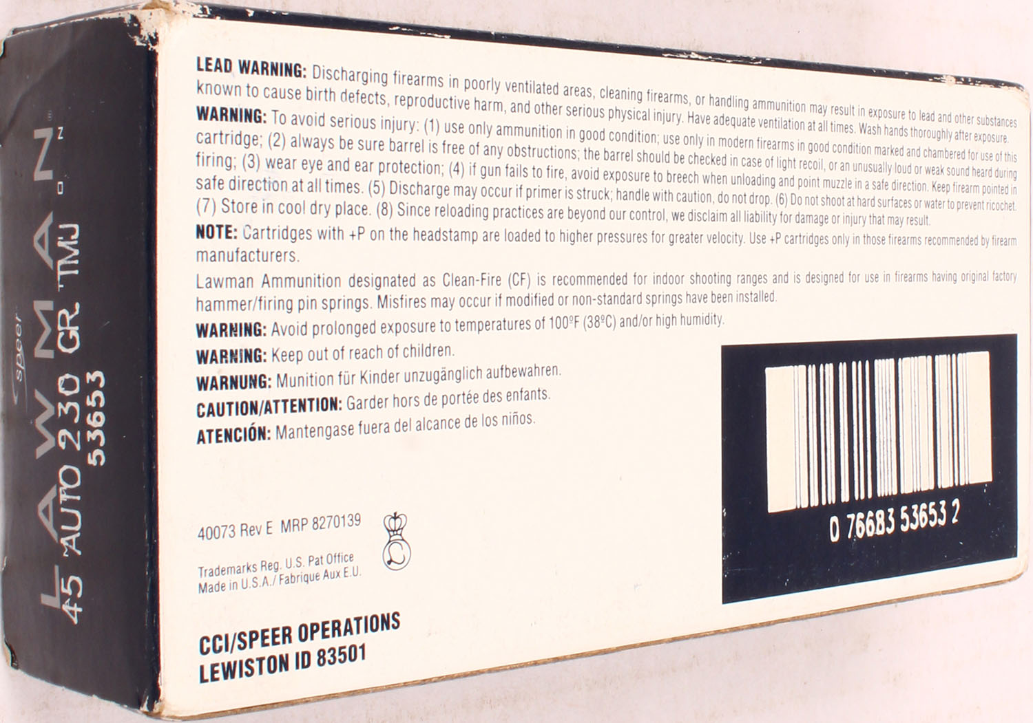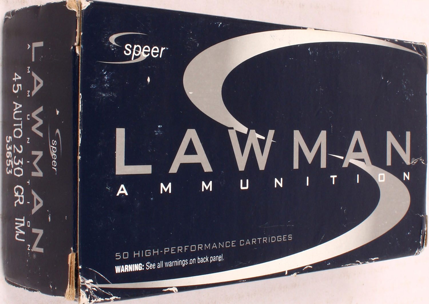 Speer, Lawman, 45 Auto, 230 Grain TMJ, Full, 1pc. multi-colored box, box is solid, with excellent color, Ammo is very good. Grade: Excellent - Value: 20 to 60