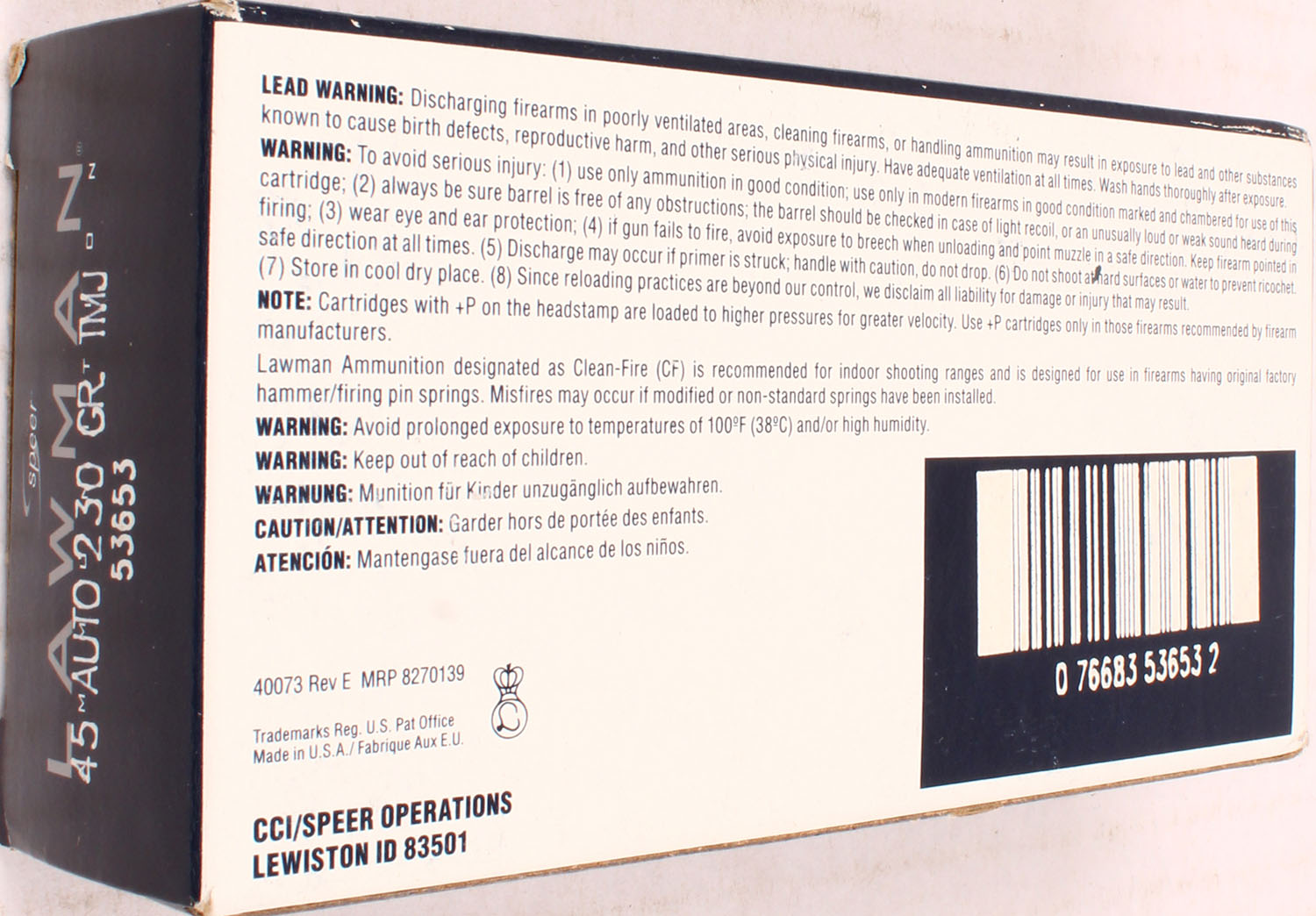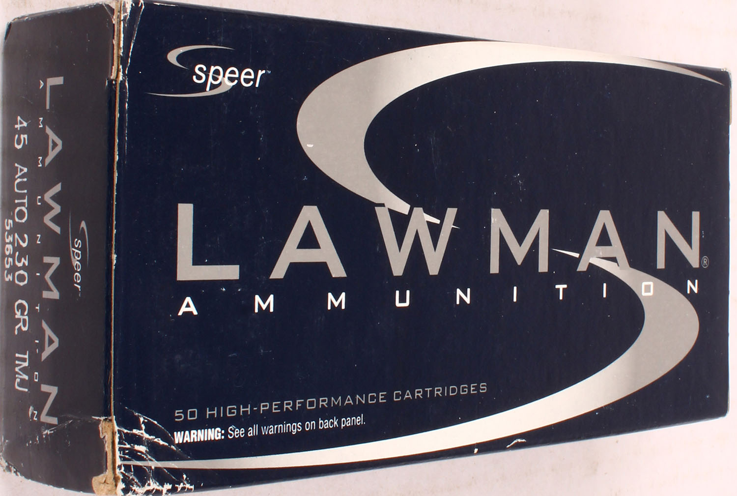 Speer, Lawman, 45 Auto, 230 Grain TMJ, Full, 1pc. multi-colored box, box is solid, with excellent color, Ammo is very good. Grade: Excellent ++ - Value: 20 to 60