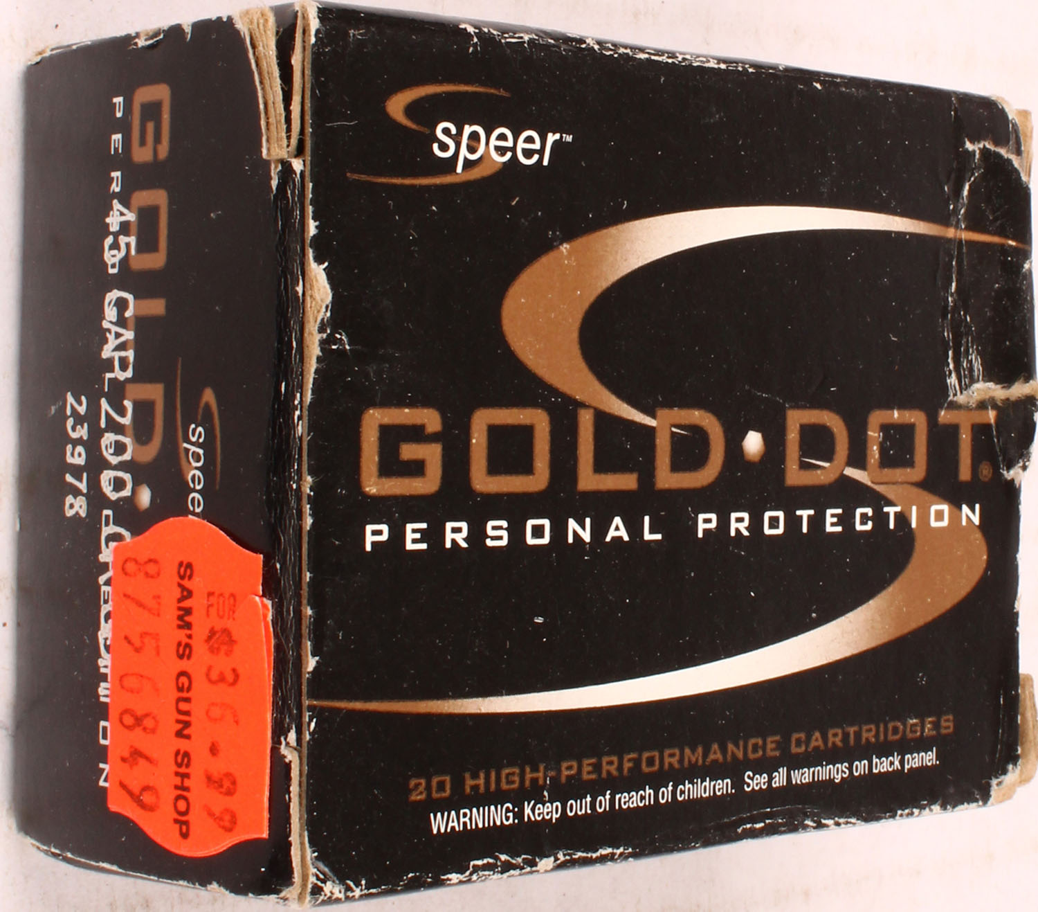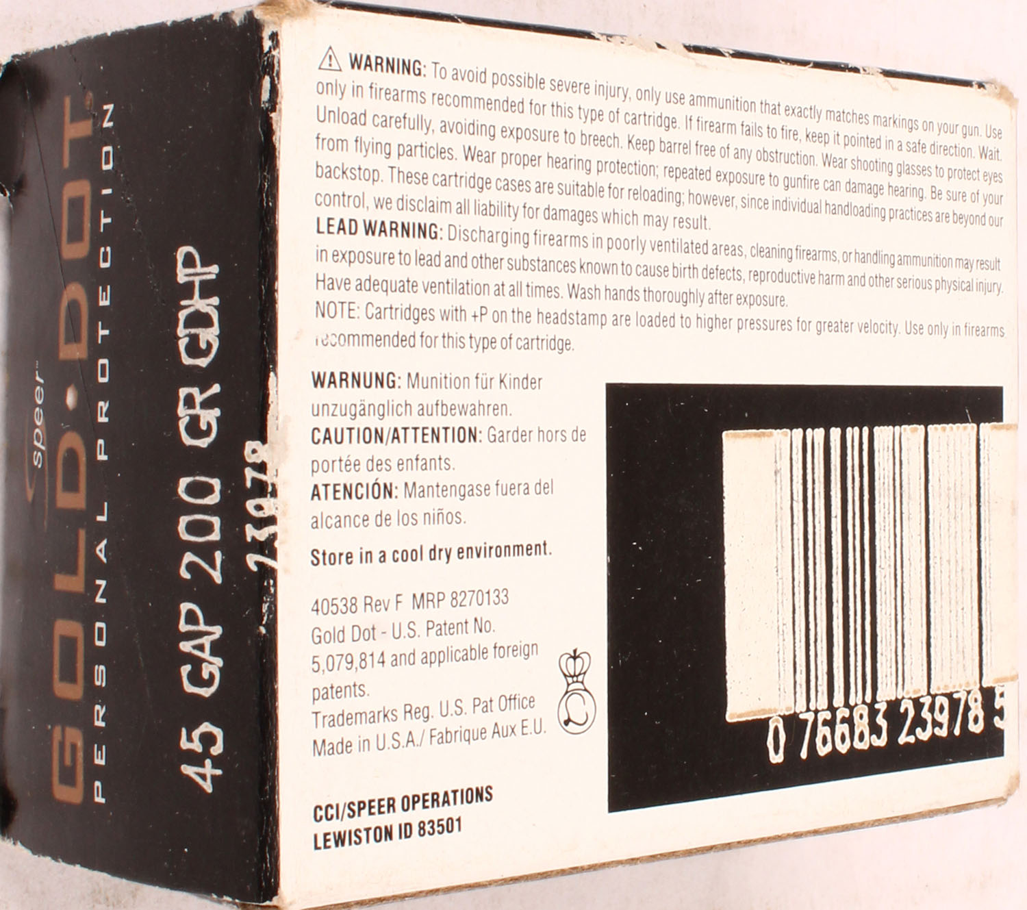 Speer, Lawman, 45 GAP, 200 Grain GDHP, Full, 1pc. multi-colored box, box is solid with excellent color, Ammo is excellent. Grade: Excellent - Value: 10 to 40