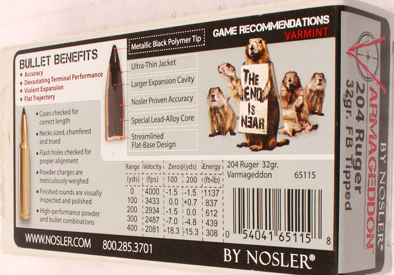 Nosler, Armageddon, 204 Ruger, 32 Grain FB Tipped, Full, 1pc. multi-colored box, box is solid with excellent color, Ammo is excellent. Grade: Excellent ++ - Value: 20 to 60