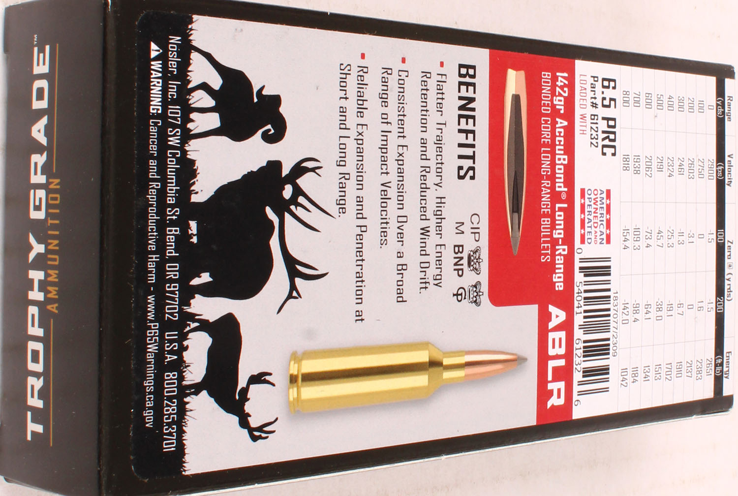 Nosler, Trophy Grade, 6.5 PRC, 142 Grain ABLR, Full, 1pc. multi-colored box, box is solid with excellent color, Ammo is excellent. Grade: Excellent ++ - Value: 20 to 80