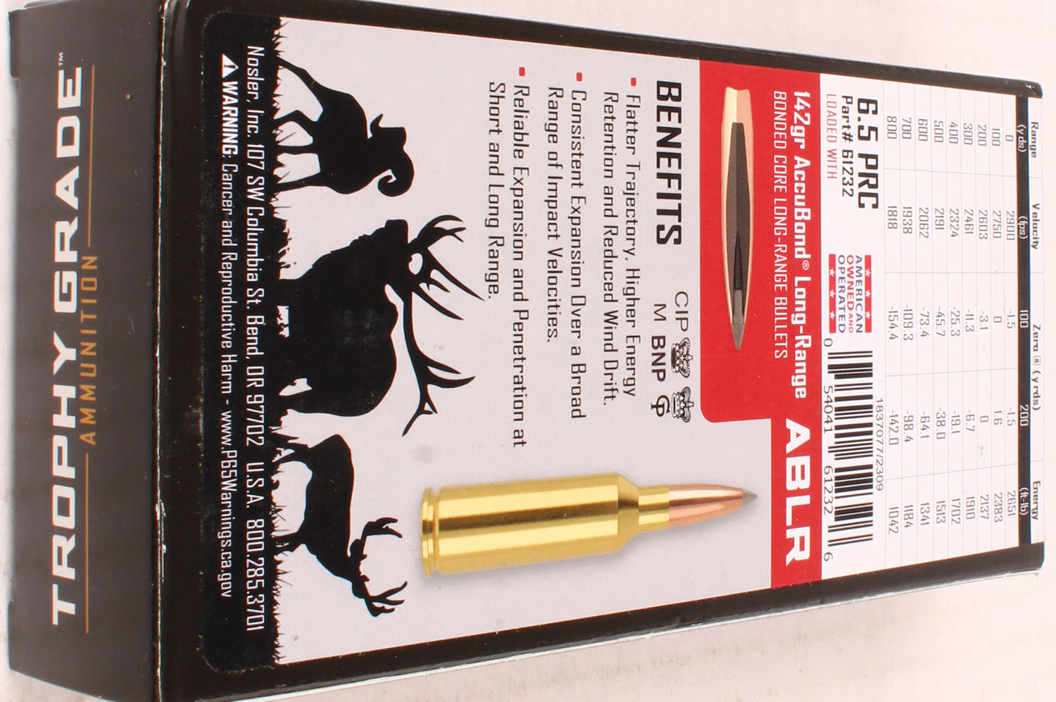 Nosler, Trophy Grade, 6.5 PRC, 142 Grain ABLR, Full, 1pc. multi-colored box, box is solid with excellent color, Ammo is excellent. Grade: Excellent ++ - Value: 20 to 80