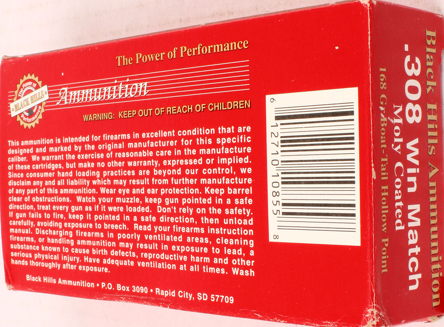 Black Hills, 308 Win Match Moly Coated, 168 Grain Boat-Tail Hollow Point, Full, 1pc. multi-colored box, box is solid with excellent color, Ammo is excellent. Grade: Excellent ++ - Value: 20 to 60