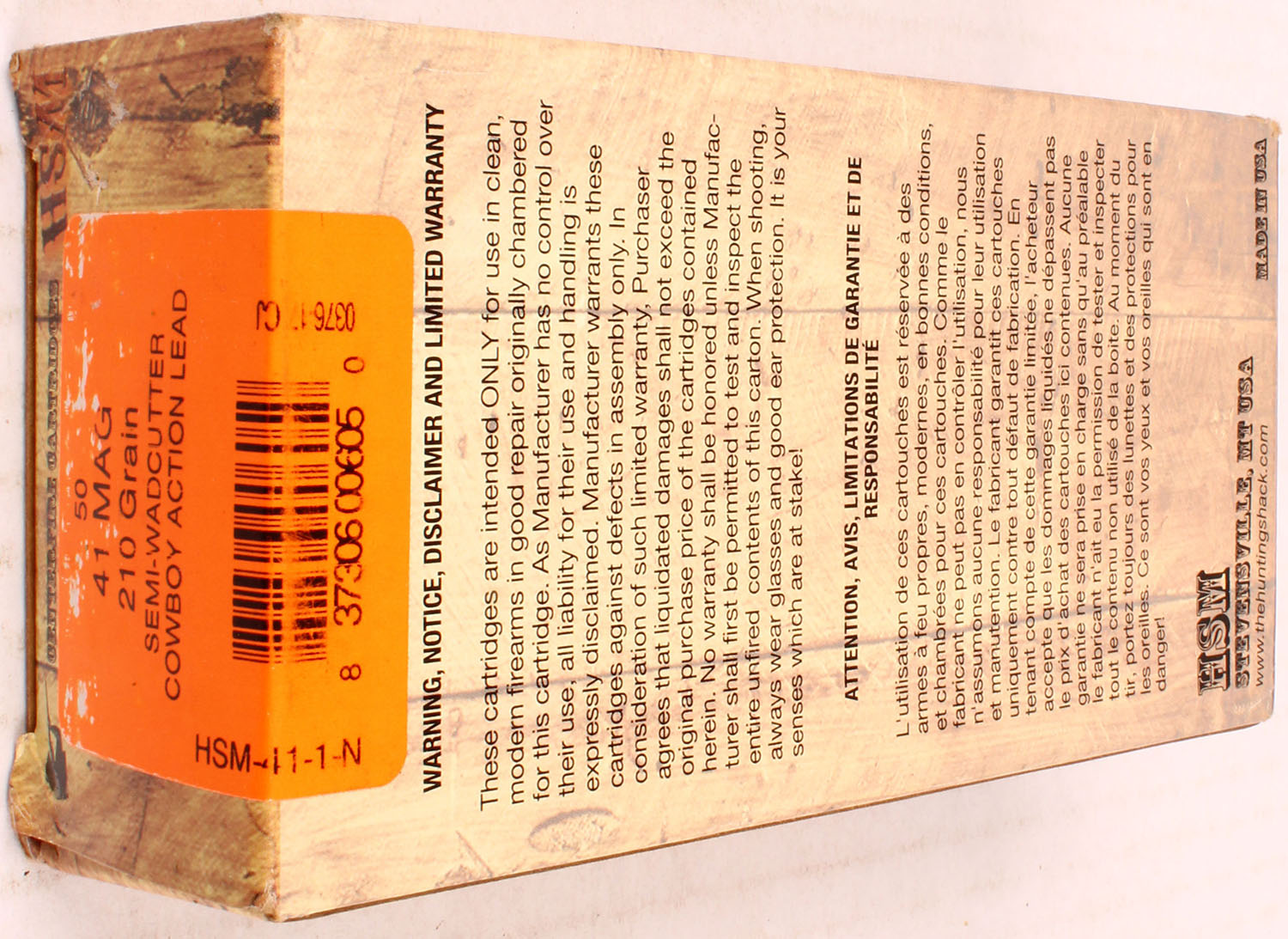 HSM, 41 mag, 210 Grain Semi-Wadcutter Cowboy Action Lead, Full, 1pc., multi-colored box, box is solid with excellent color, Ammo is excellent. Grade: Excellent ++ - Value: 20 to 60