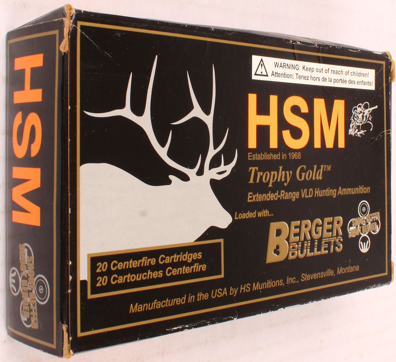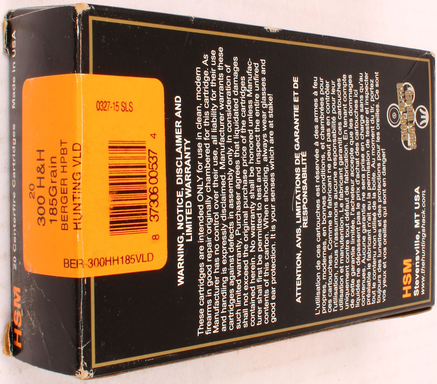 HSM, Trophy Gold, 300 H&H, 185 Grain Berger HPBT Hunting VLD, Full, 1pc., multi-colored box, box is solid with excellent color, Ammo is excellent. Grade: Excellent ++ - Value: 20 to 80