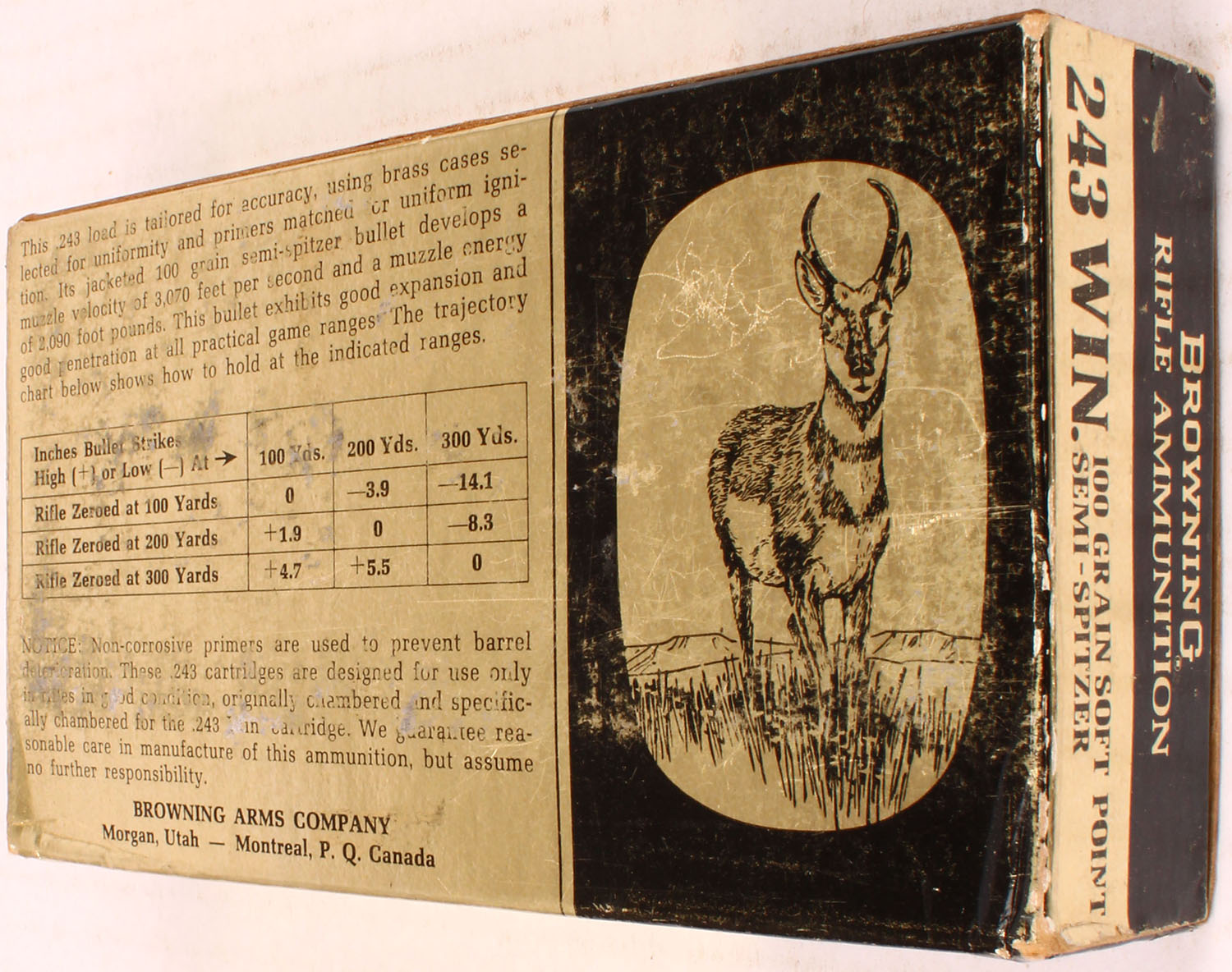 Browning, 243 Win, 100 Grain Soft Point Semi-Spitzer, Full with 2rds being fired brass, 1pc., multi-colored box, box is solid with shelf wear, Ammo is excellent. Grade: Excellent + - Value: 20 to 60