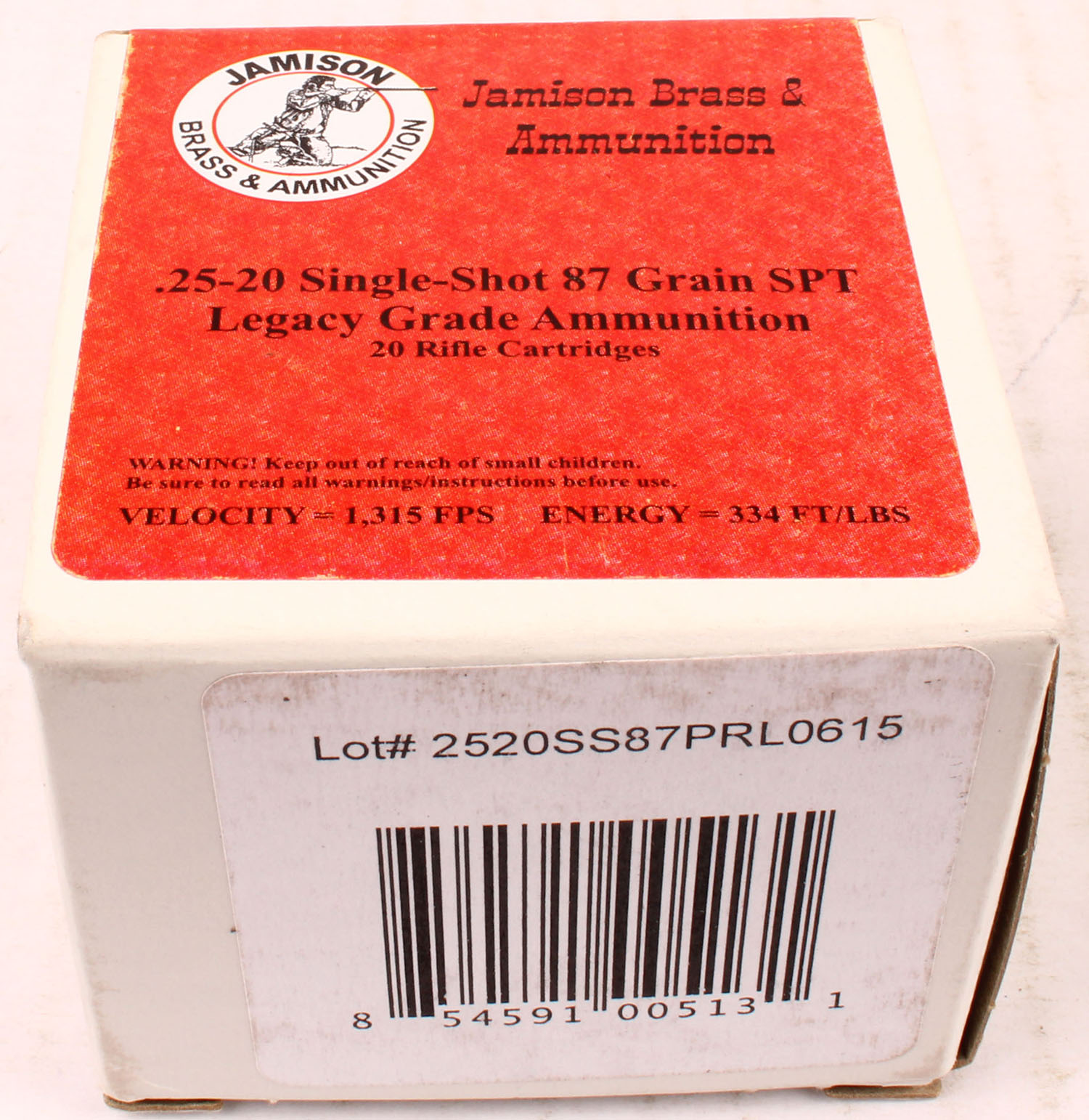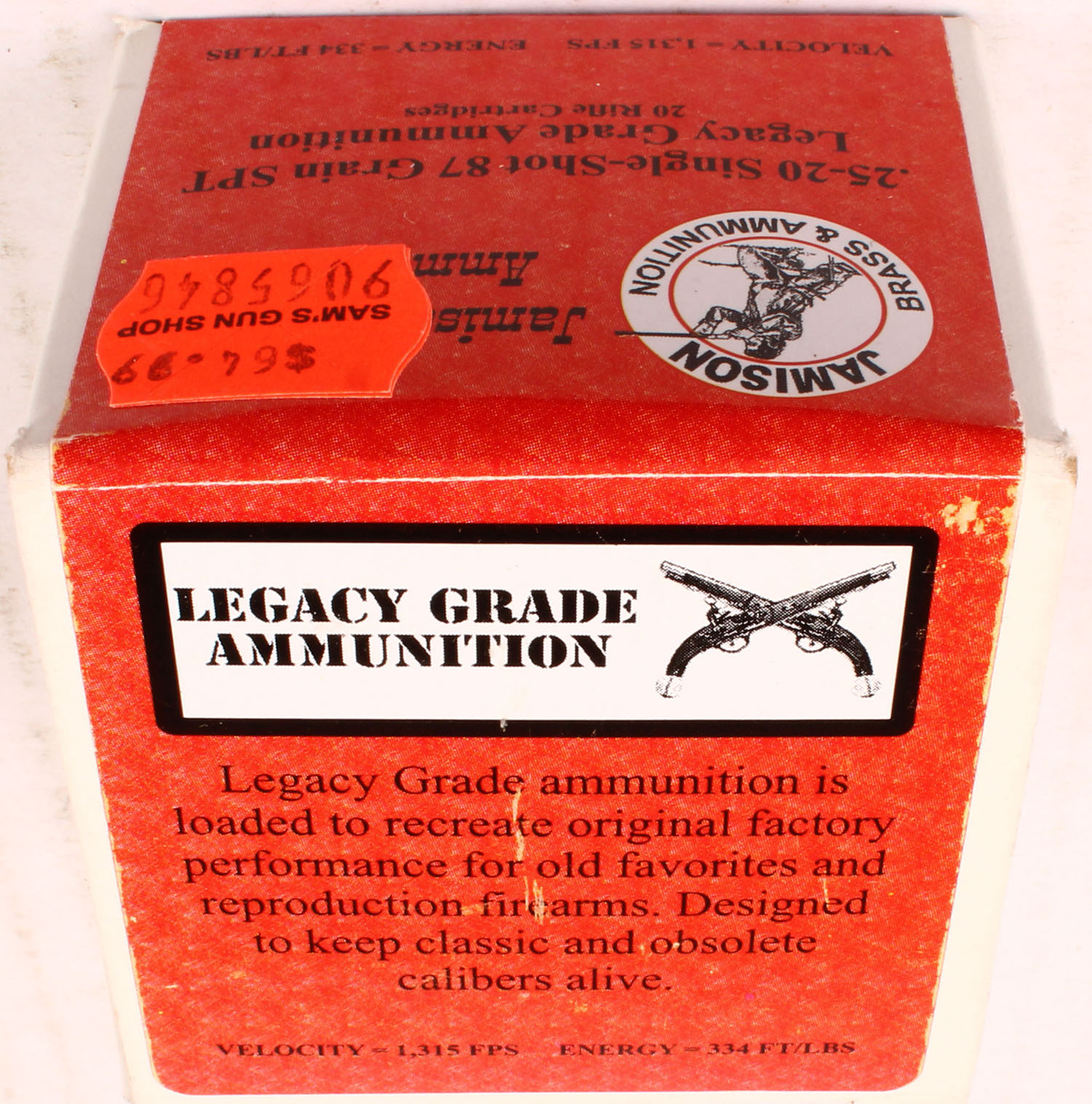 Jamison Brass & Ammunition, 25-20 Single Shot, 87 Grain SPT Legacy Grade, Full, 1pc., multi-colored box, box is solid, with excellent color, Ammo is excellent. Grade: Excellent ++ - Value: 40 to 120