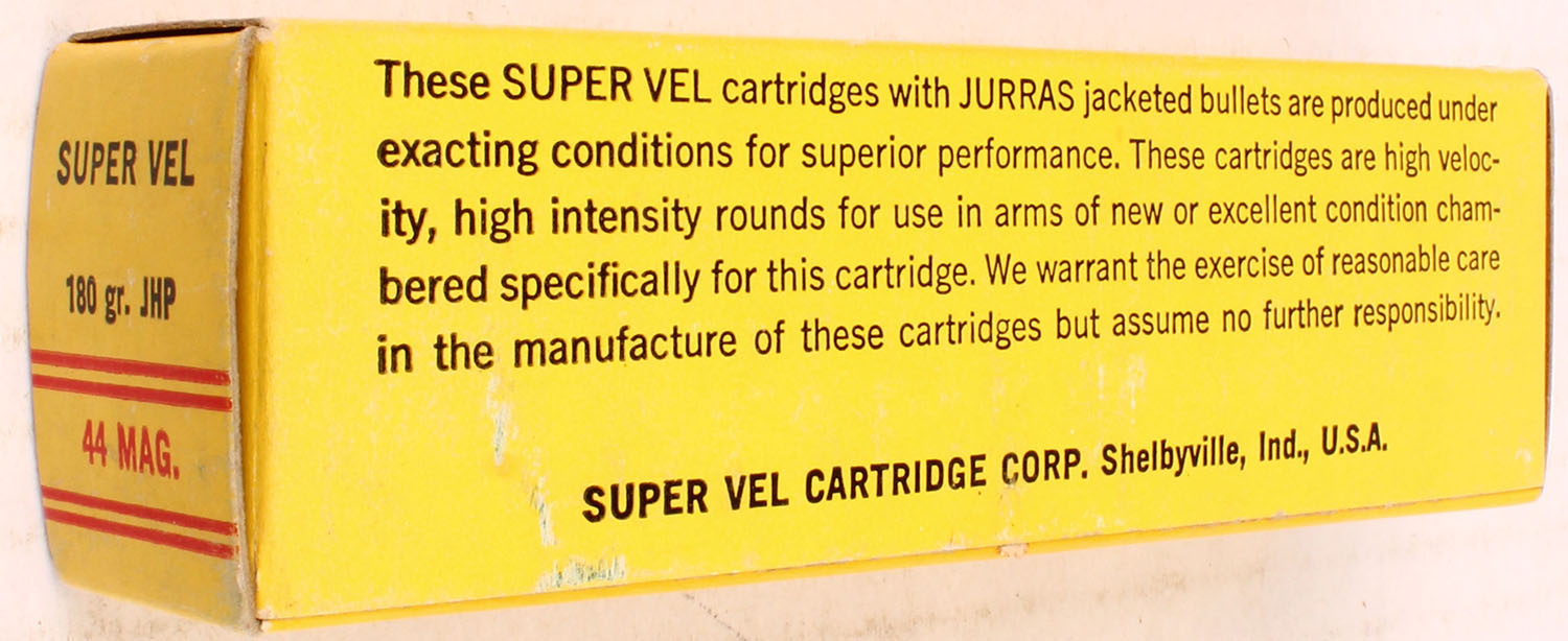 Super Vel, .44 Magnum, 180 Gr. JHP, 1pc, Full, yellow box with red/black print, box is solid with pen marks, rub marks, & light edge wear, ammo is excellent. Grade: Excellent - Value: 20 to 40