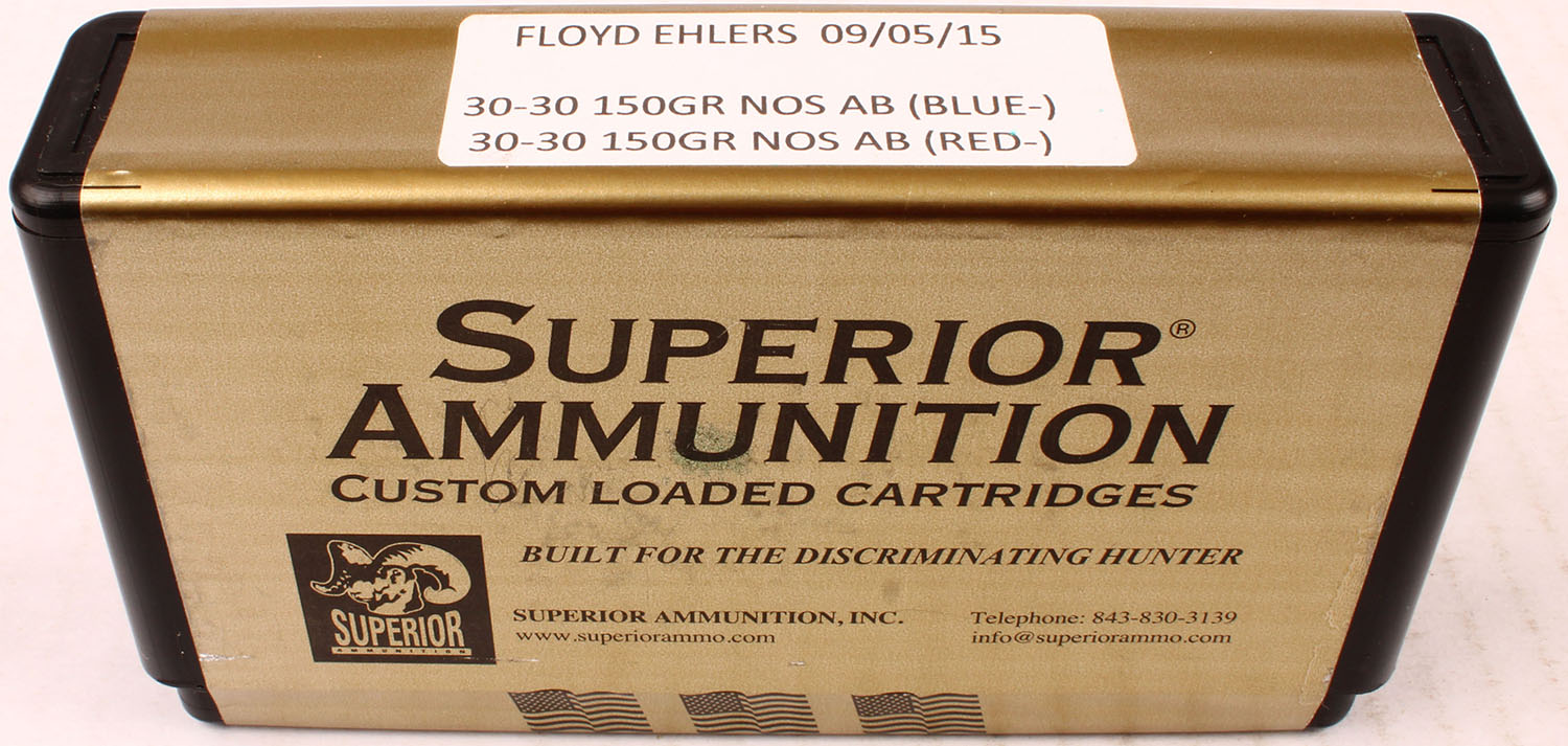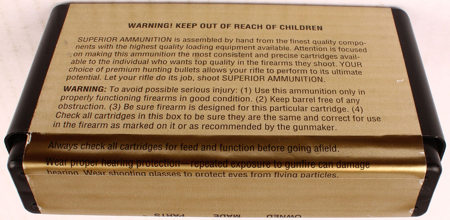 Superior Ammunition, Custom Loaded Cartridges, .30-30, 150 Gr. NOS AB, 2pc, FULL & SEALED, black plastic box with gold label & black print, box is solid with light scratches. Grade: Excellent - Value: 30 to 60
