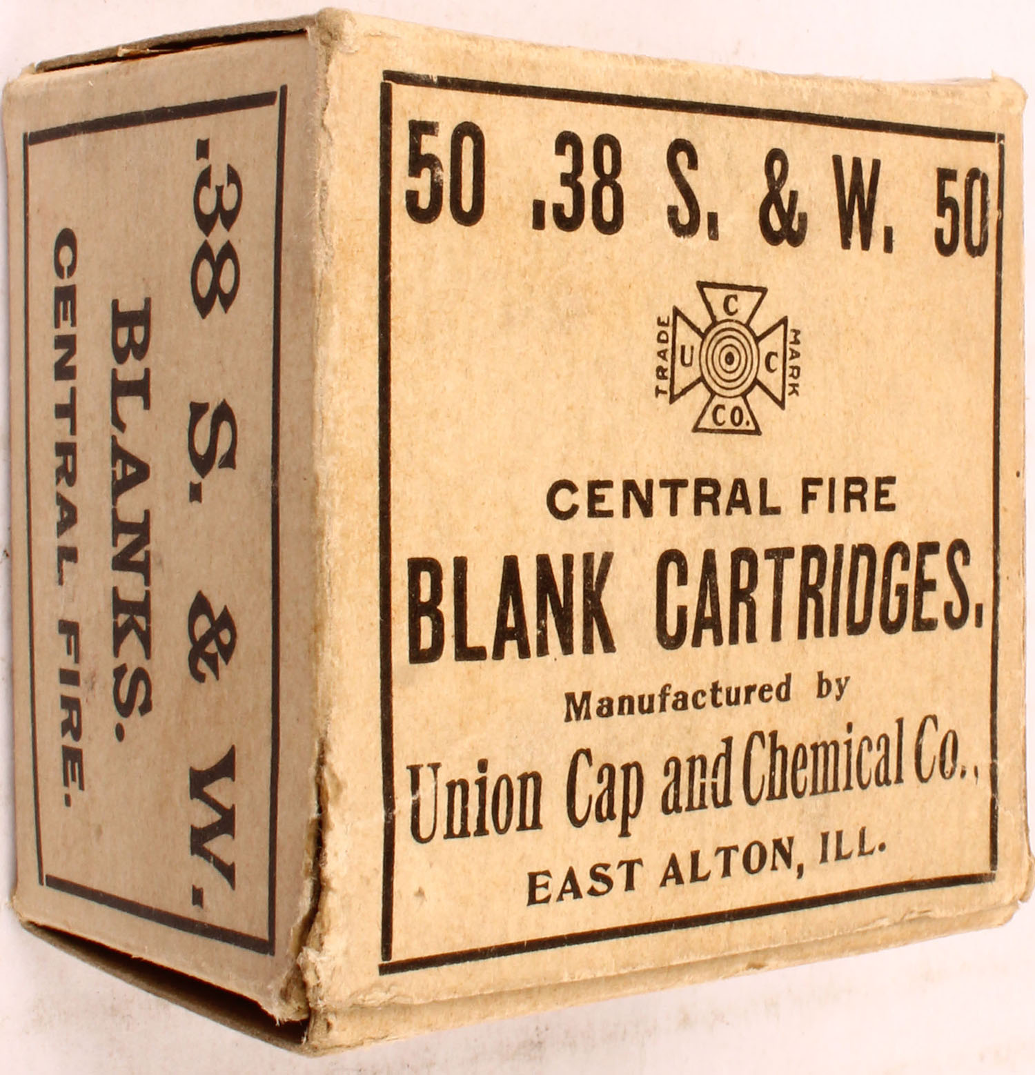 Union Cap & Chemical Co., .38 S&W Blanks, 1pc, Full, buff box with black print, box is solid with light wear, ammo is very good. Grade: Excellent ++ - Value: 10 to 30